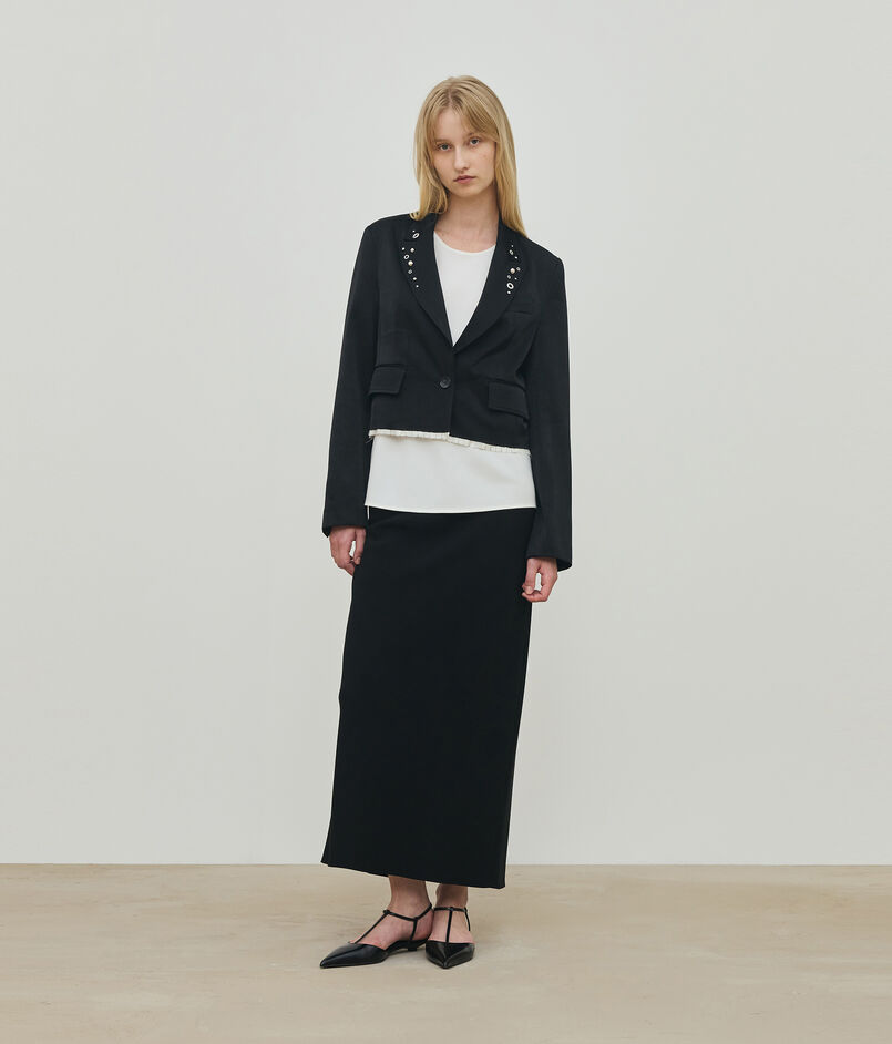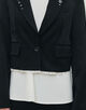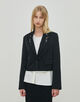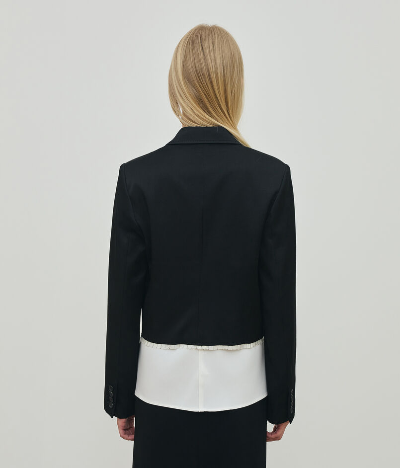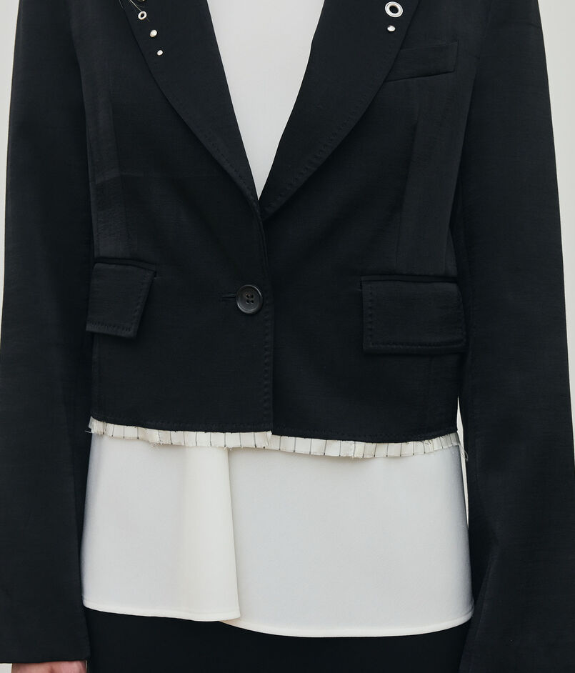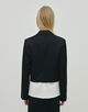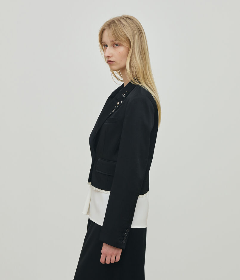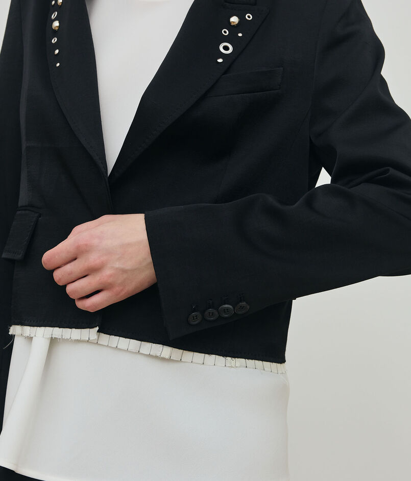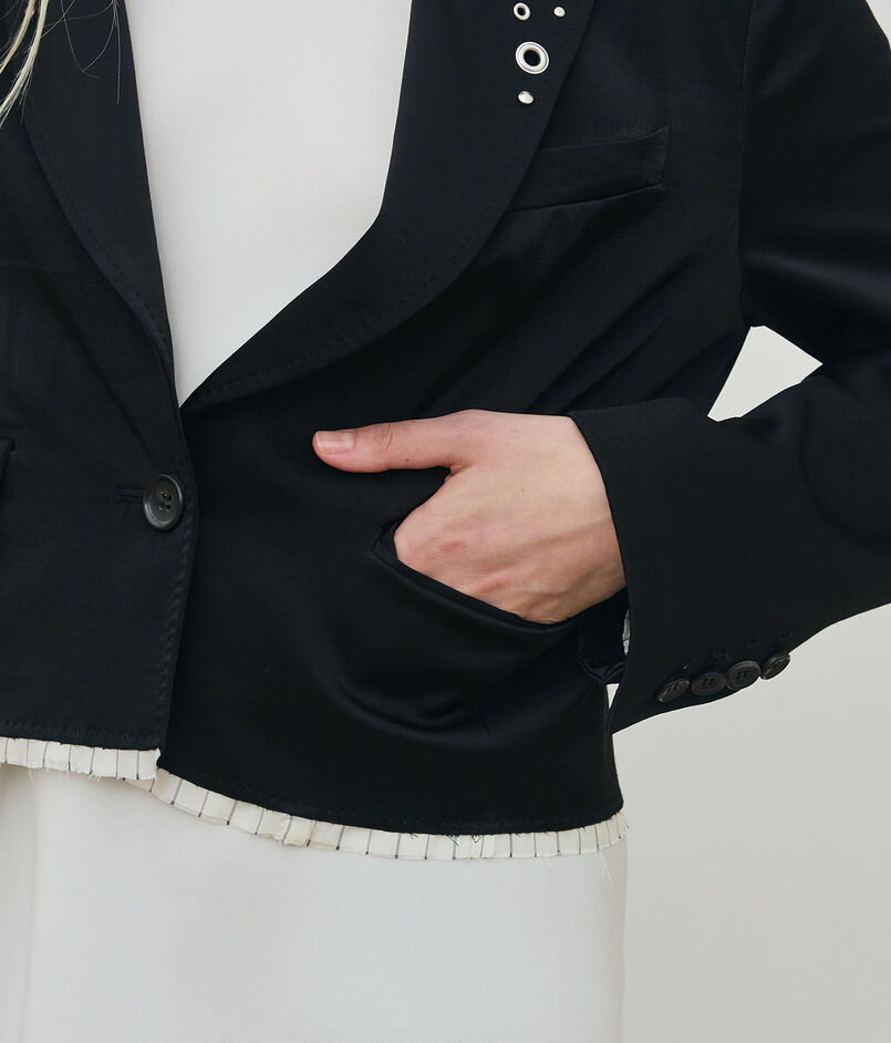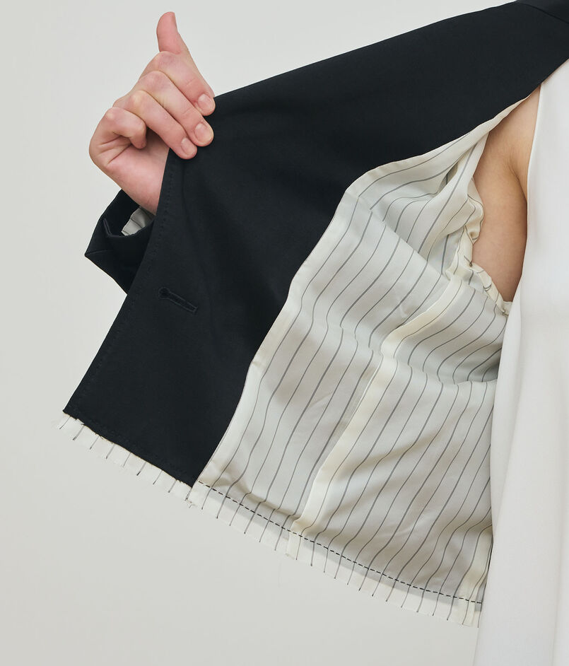 大胆なクロップド丈でコンパクトなシルエットのジャケットは、ストライプの断ち切り裏地でアクセントをつけた一着。