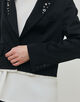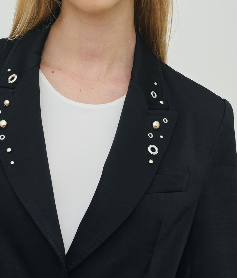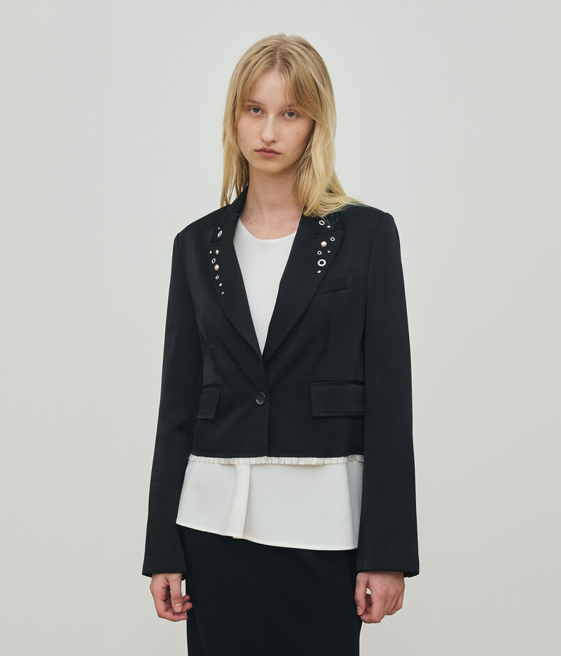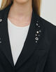 スタッズやハトメ、カシメをランダムに散りばめることでアクセサリーのようなブローチのような装飾でエッジを効かせています。