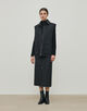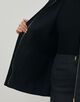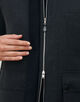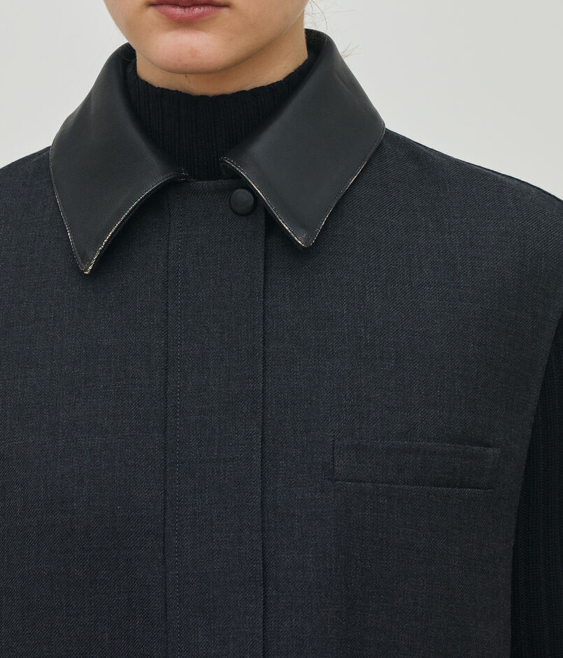 襟やボタン、ファスナーにはレザーをあしらい、シャープなアクセントをつけています。