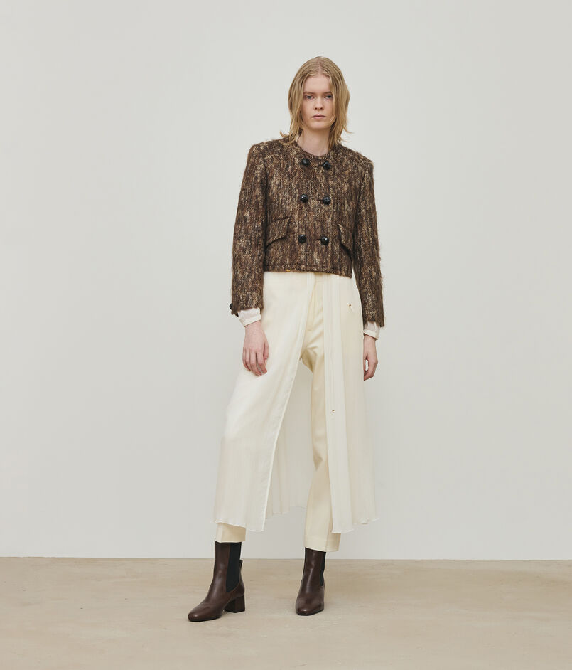 ショート丈のジャケットはコンパクトなシルエットで上品に仕上げ、ボトムのバランスを選ばない一点。今シーズンは、細身のトップスとパンツですっきりとまとめるスタイリングもおすすめです。