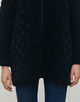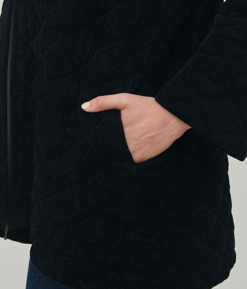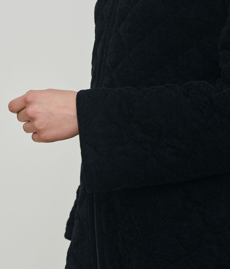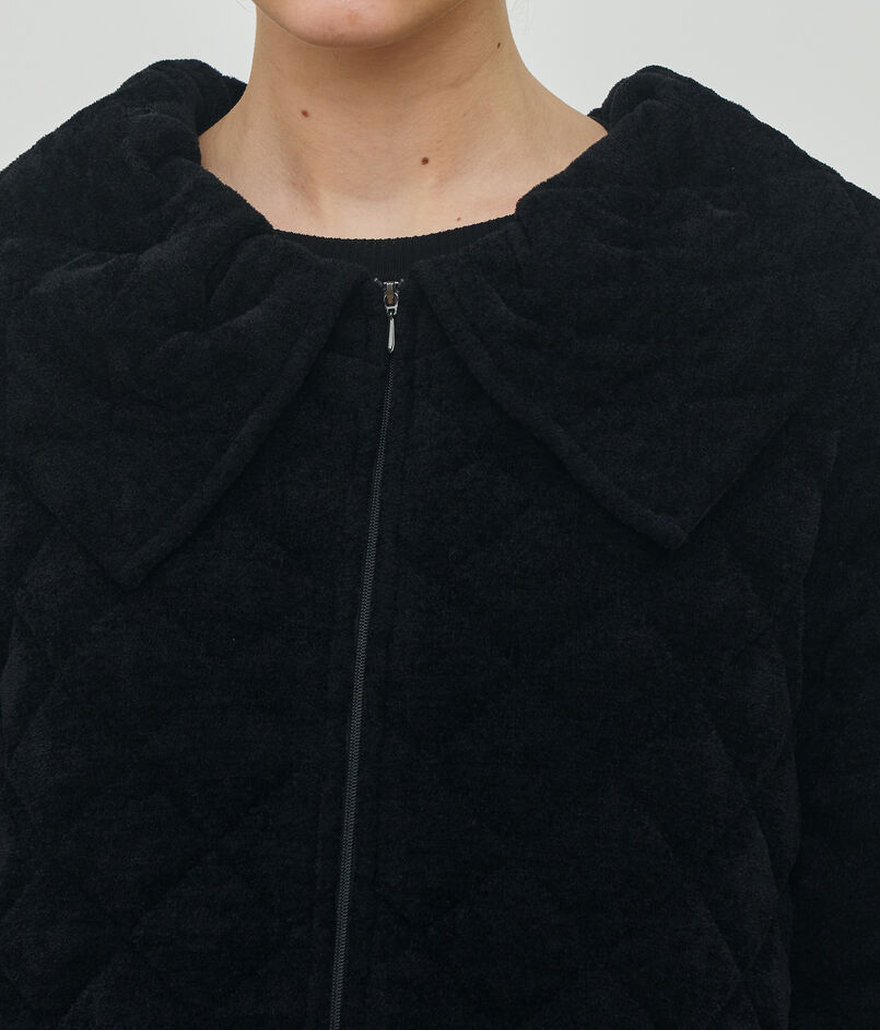 インレイ編みの手法を利用し、モール組織とポリエステル組織の間にさらにバルキーなポリエステル糸を横方向に飛ばし、まるでキルティングのような膨らみのある柄組織に仕上げた一着。