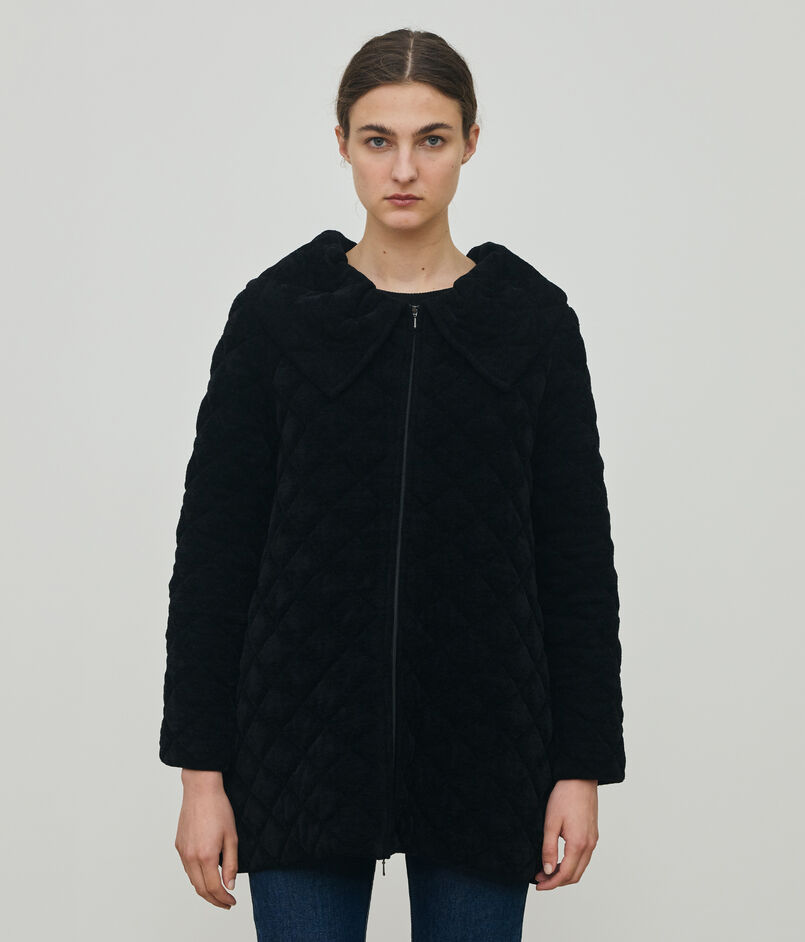 ギャザーでふんわりとさせた大きめの襟デザインで顔まわりに華やさをプラスしています。