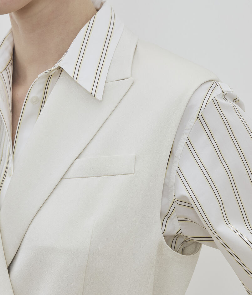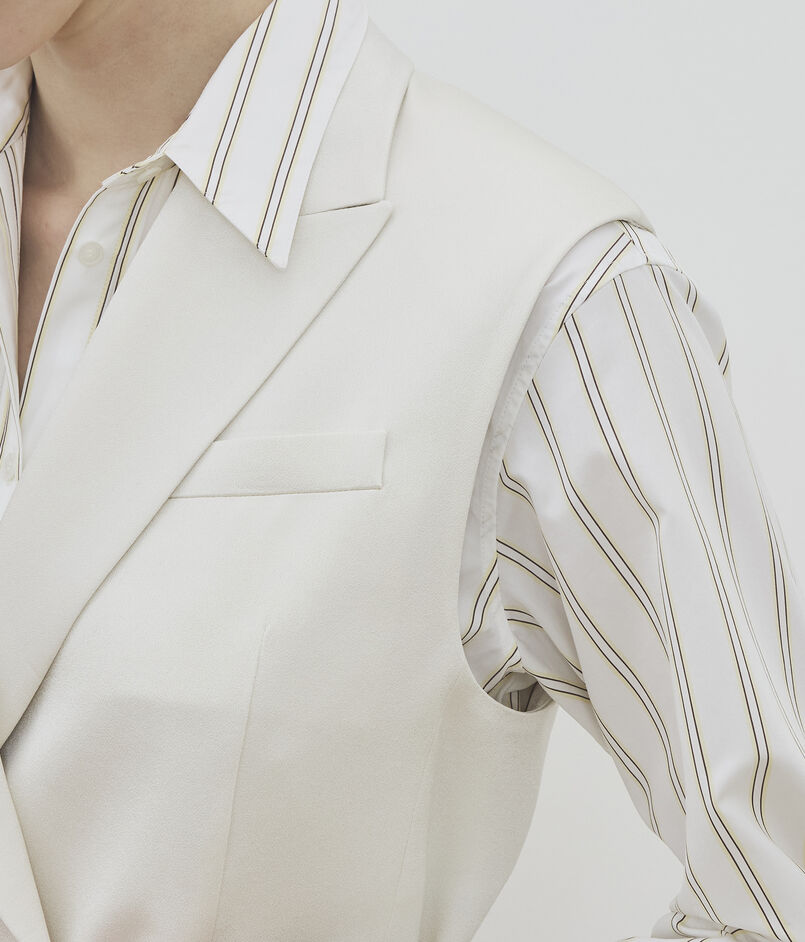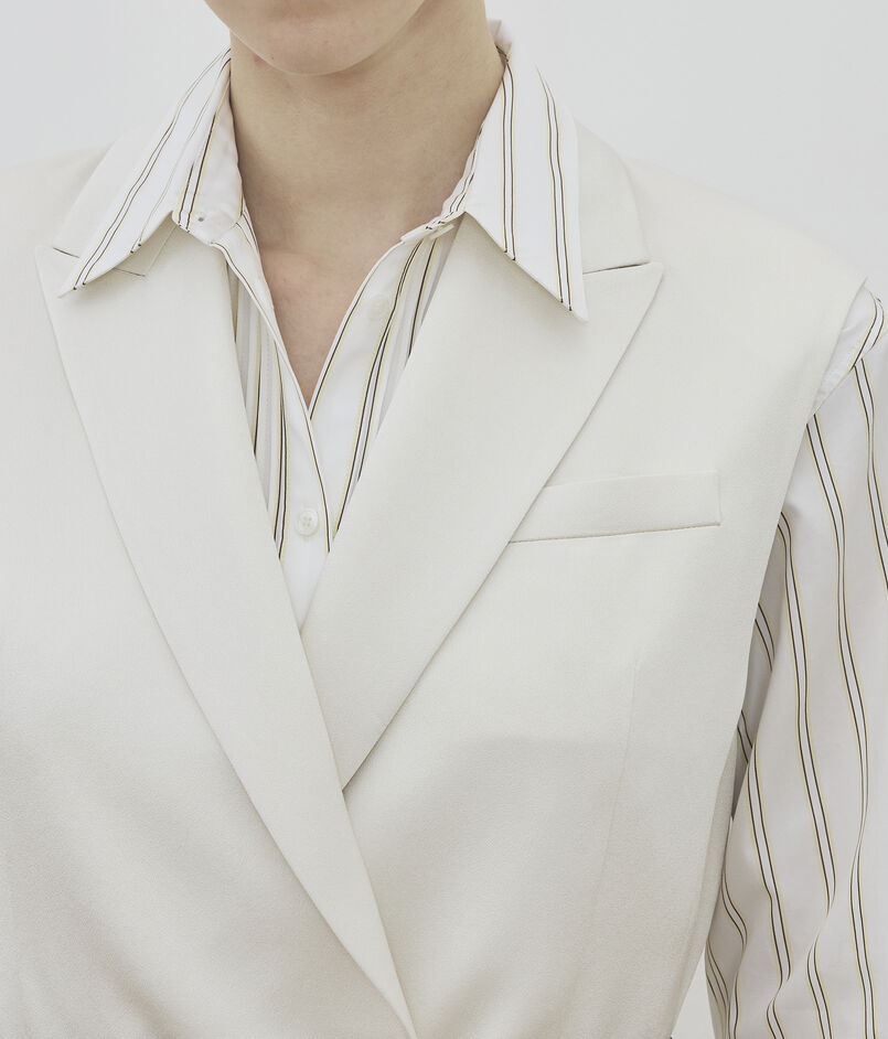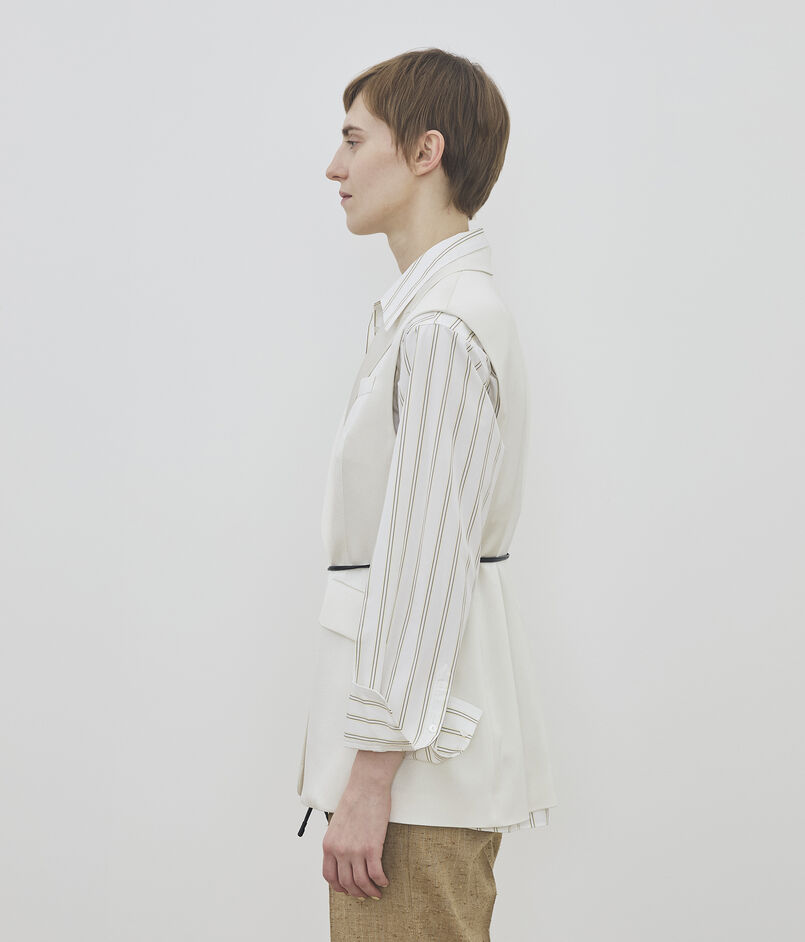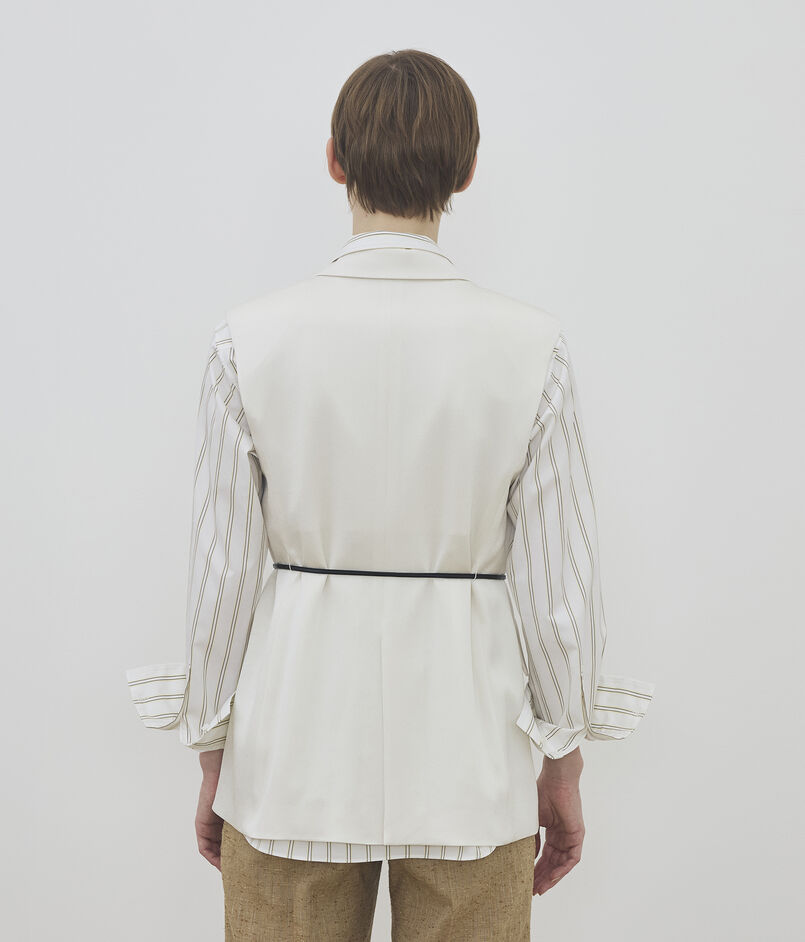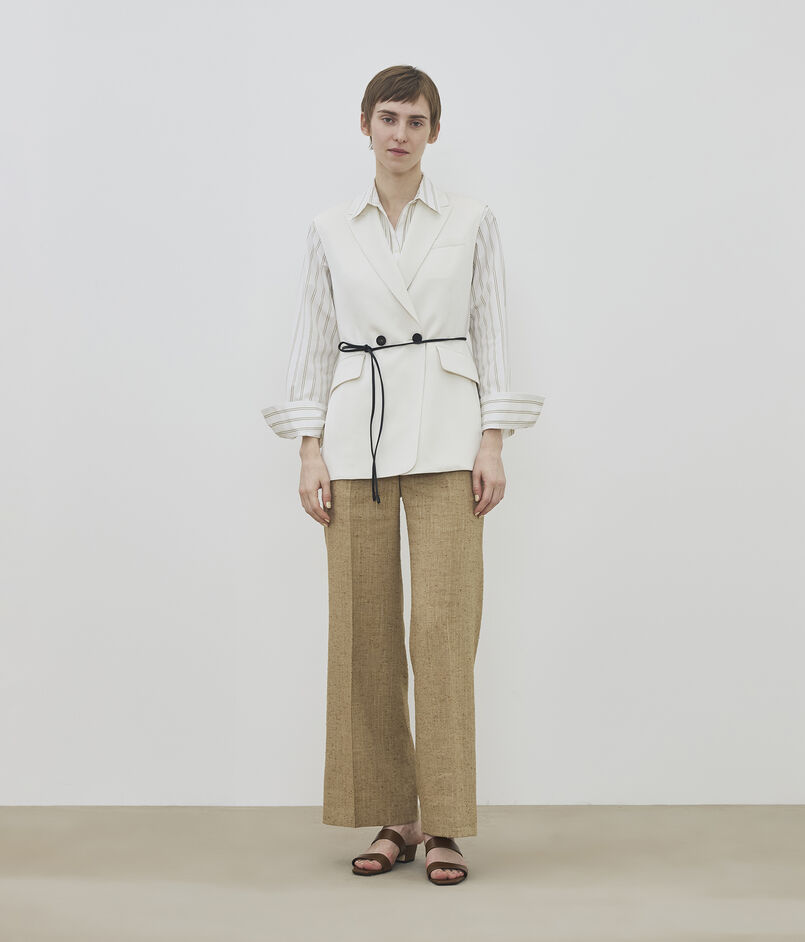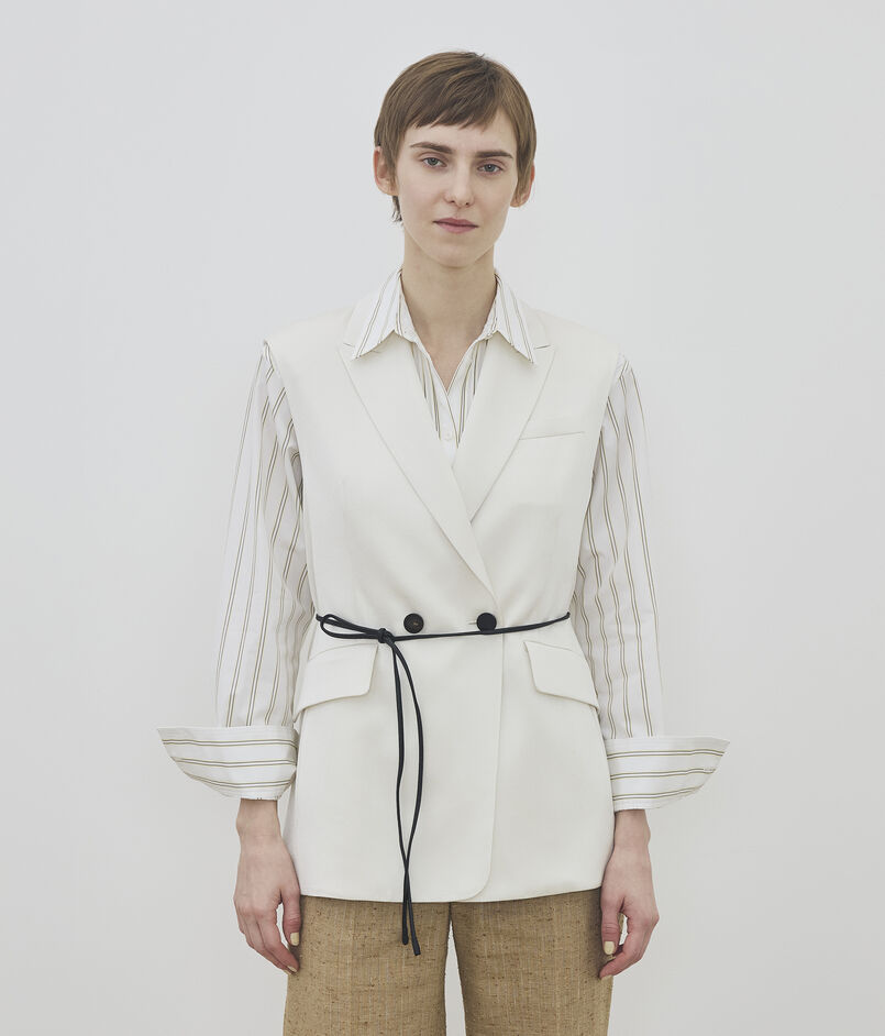 シャープなパターン×落ち感のある素材の組み合わせでほど良い抜け感のある印象に仕上げたジレ。