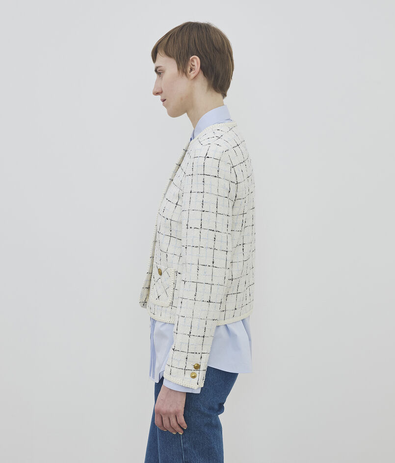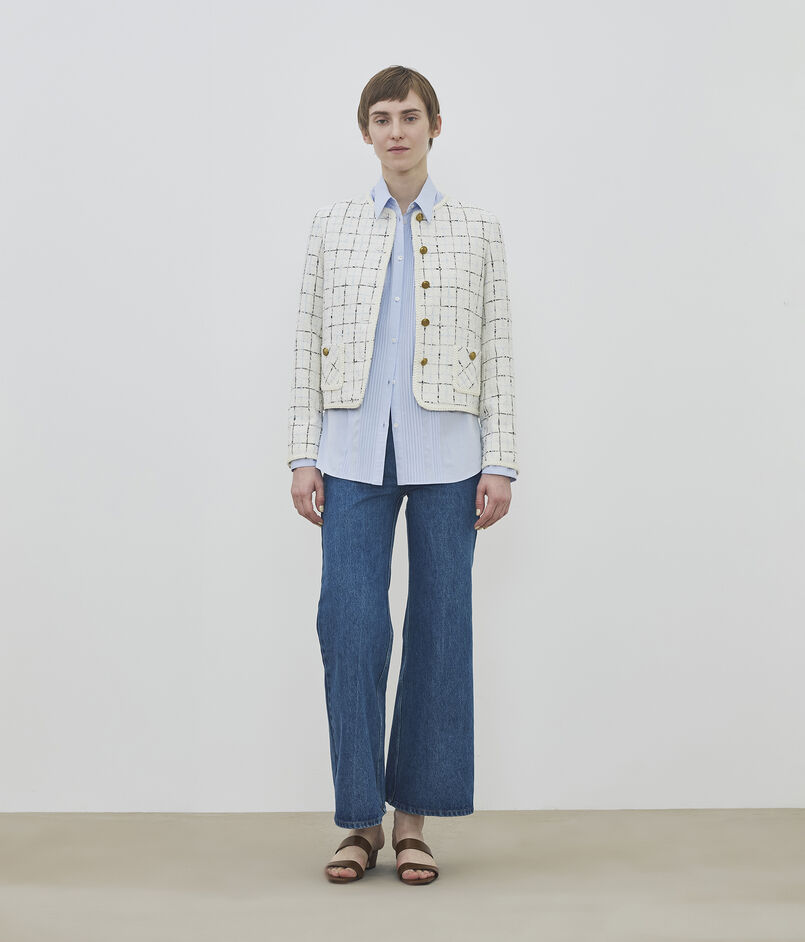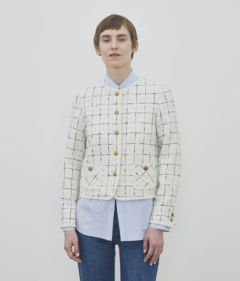 爽やかでエレガントな印象のノーカラージャケットは、素材の良さが際立つシンプルなデザイン。