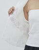 シルクシフォン素材の紐はフロントでリボン結びにするだけでなく、ラフに垂らして着こなすのもおすすめ。