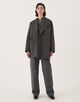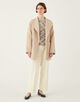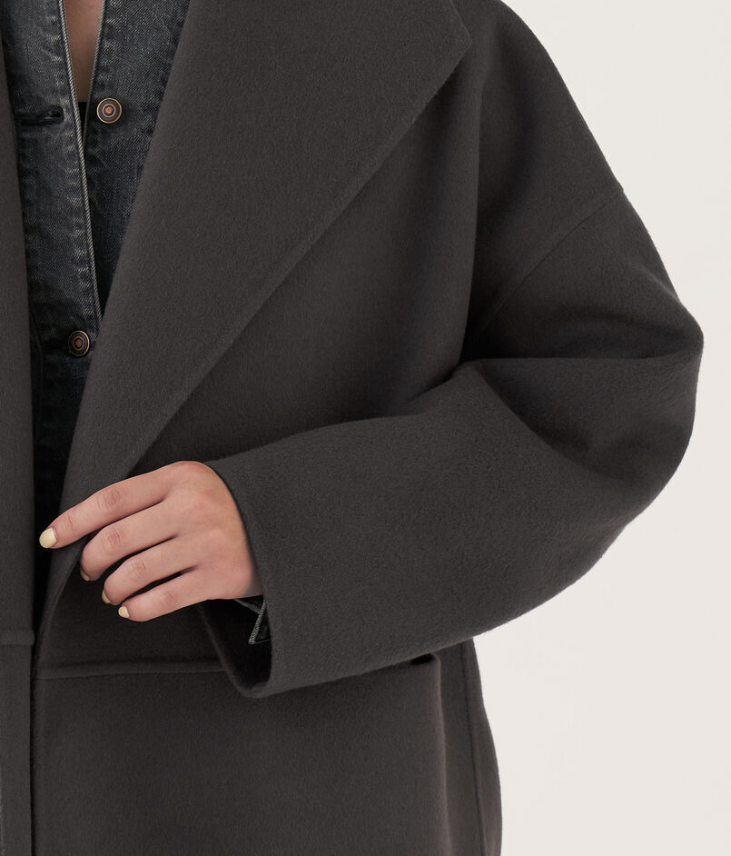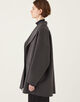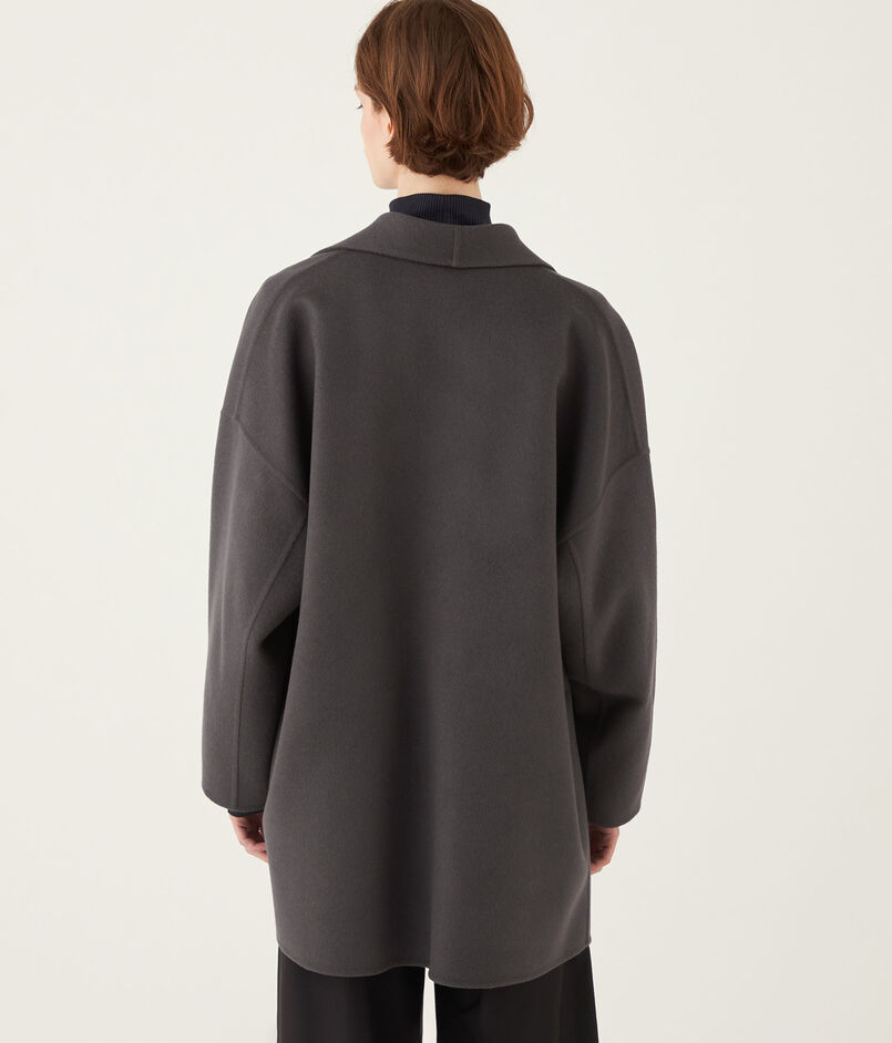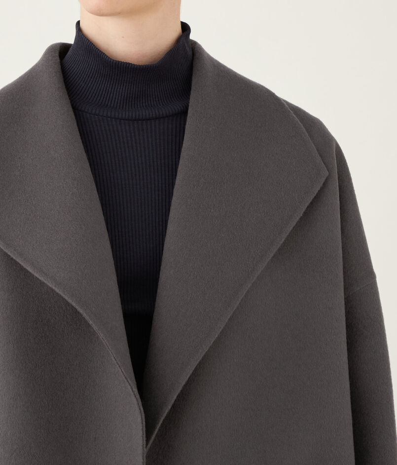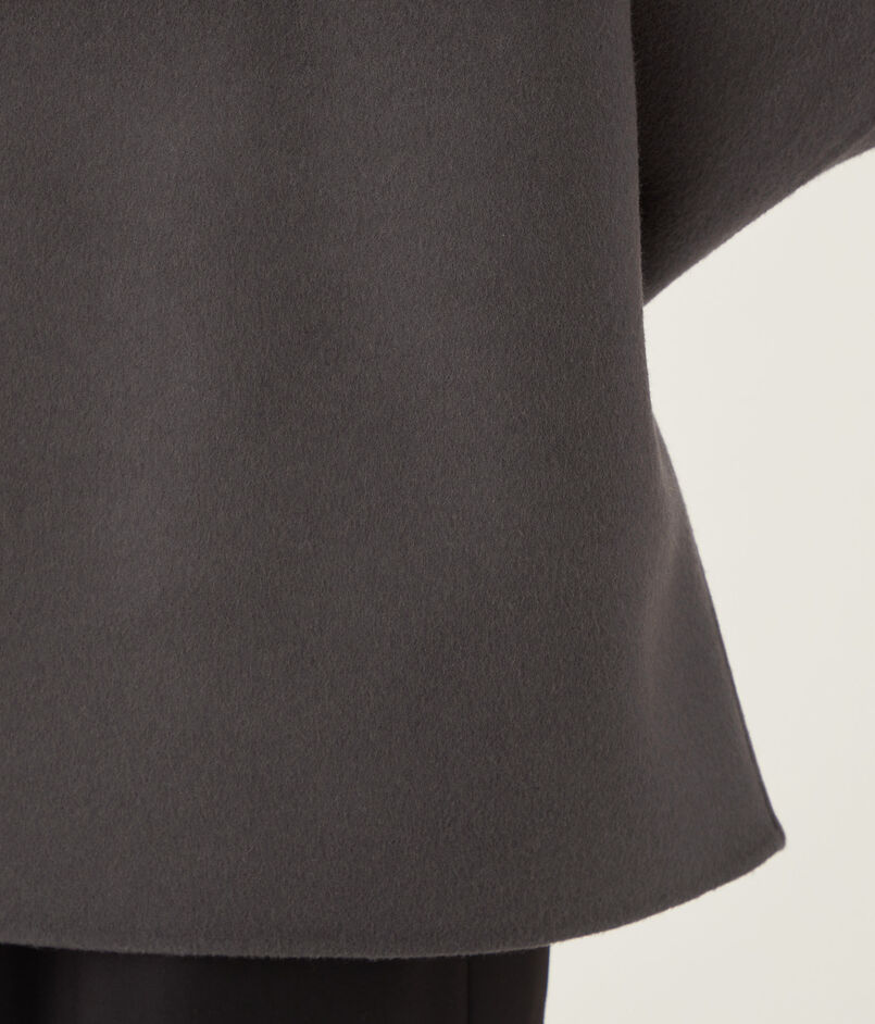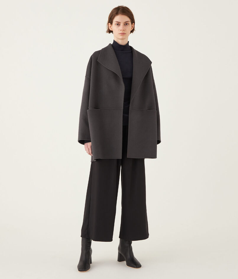 ショートコートはストールのような大きな襟がポイントで、顔まわりに女性らしく柔らかい雰囲気を演出してくれる一着。