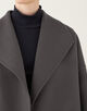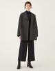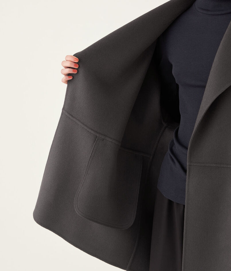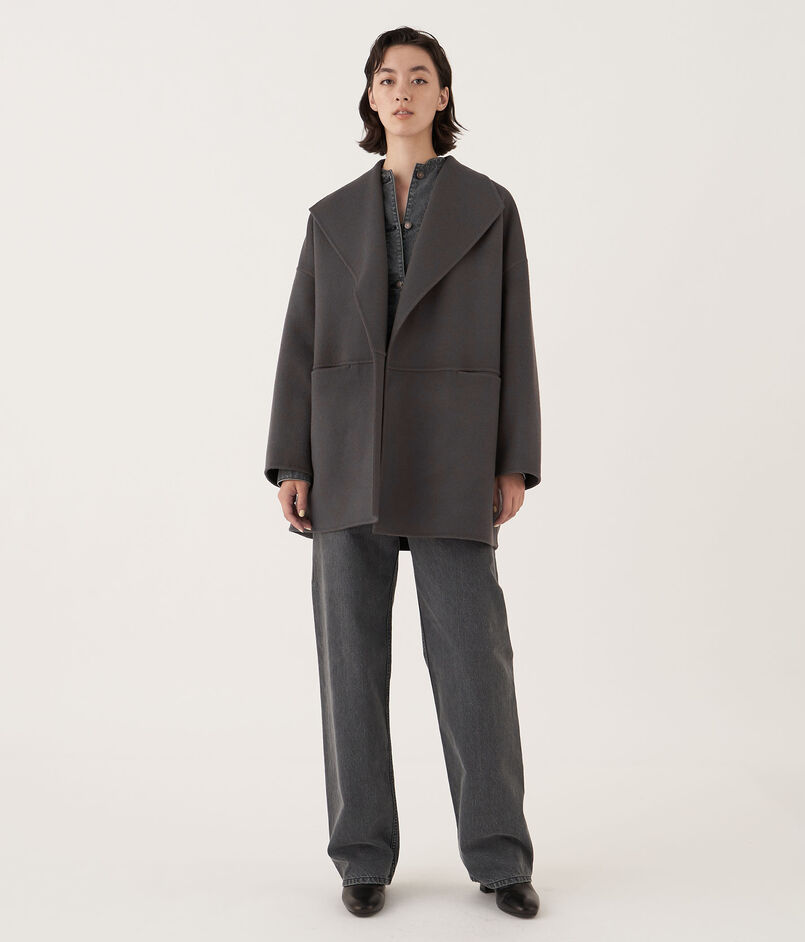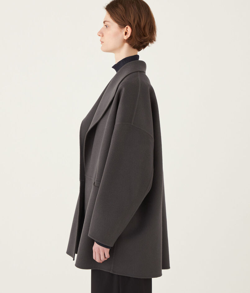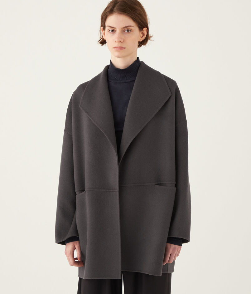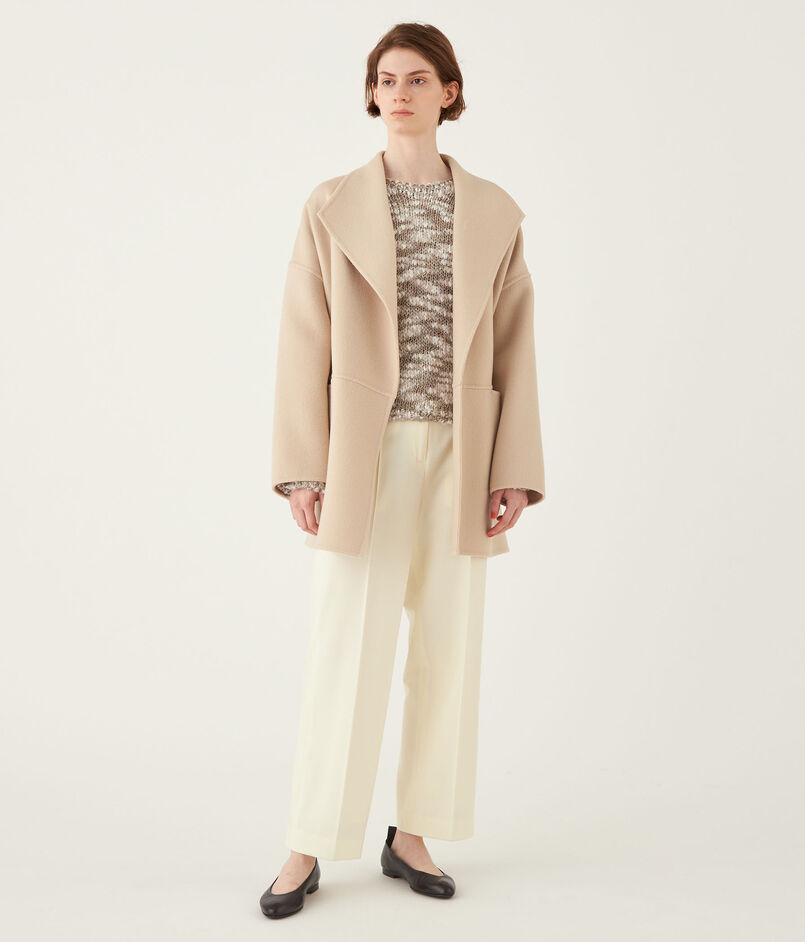 ショートコートはストールのような大きな襟がポイントで、顔まわりに女性らしく柔らかい雰囲気を演出してくれる一着。
