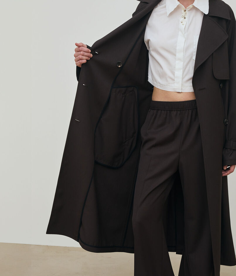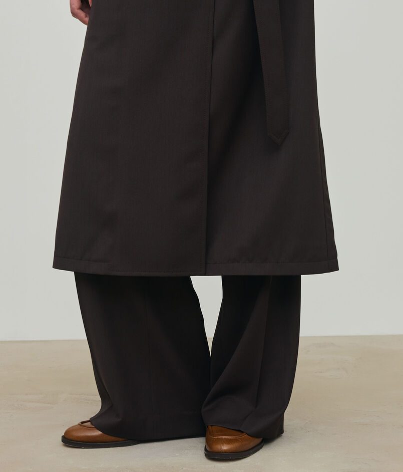〈DES PRES〉定番のタテヨコともにウールの強撚糸で織り上げた、独特の落ち感とシャリ感を兼ね備えたギャバジン素材を使用したコート。