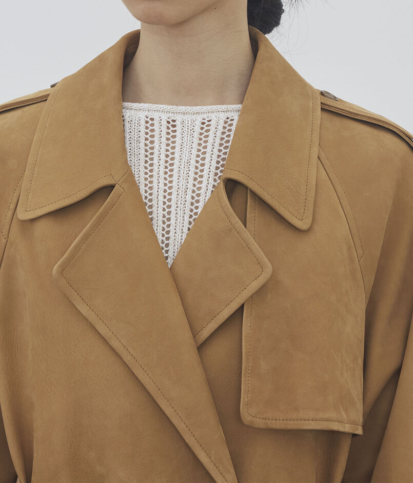 正統派なデザインでクラシカルな雰囲気がありつつも、襟元のゴージラインを低めにすることで抜け感のあるバランスに仕上げた一着。