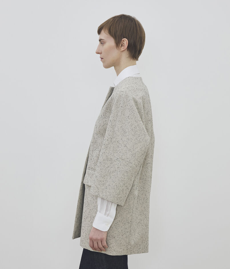 高密度ながらも空気を含んだ軽やかさがあり、レーヨンナイロンのノット糸を入れ込むことでモードな雰囲気を醸し出しています。