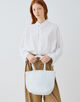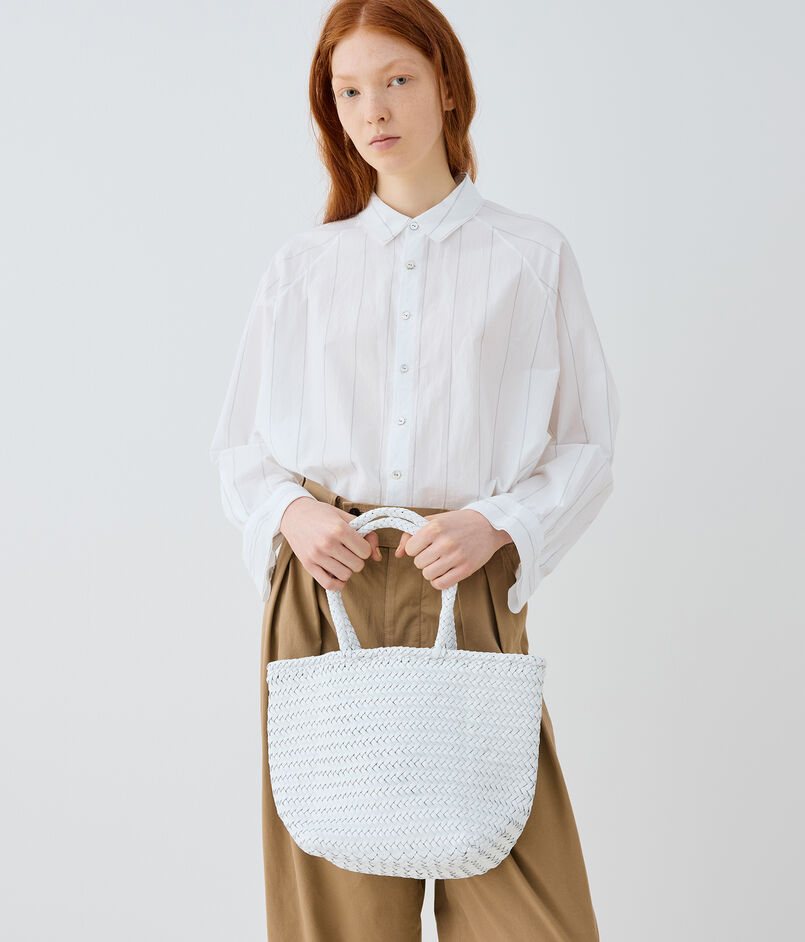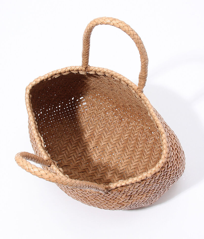 裏地のないオープントップのソフトなバッファローカーフレザーのバスケットは、エレガントな編み込みのトップハンドルと、形を保つ斜めの織りが特徴です。