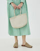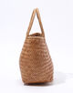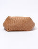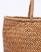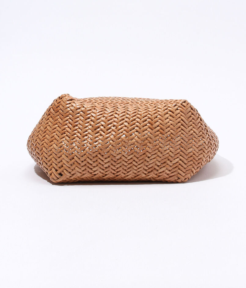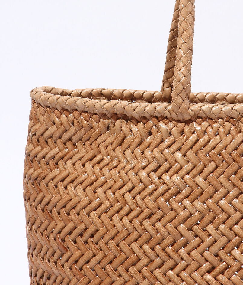 裏地のないオープントップのソフトなバッファローカーフレザーのバスケットは、エレガントな編み込みのトップハンドルと、形を保つ斜めの織りが特徴です。