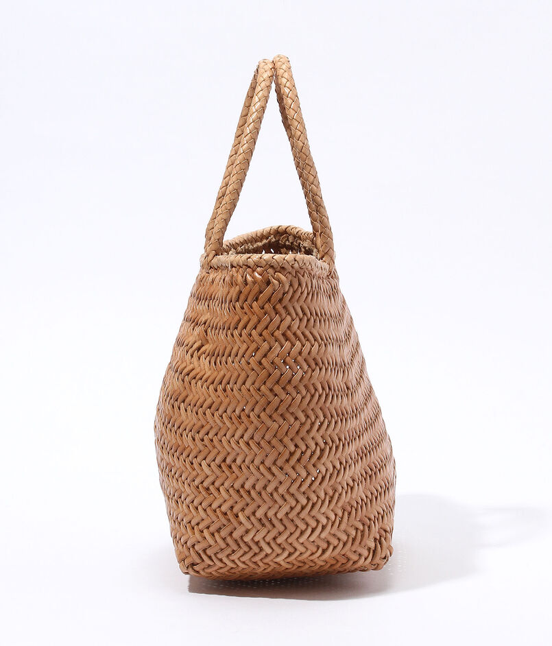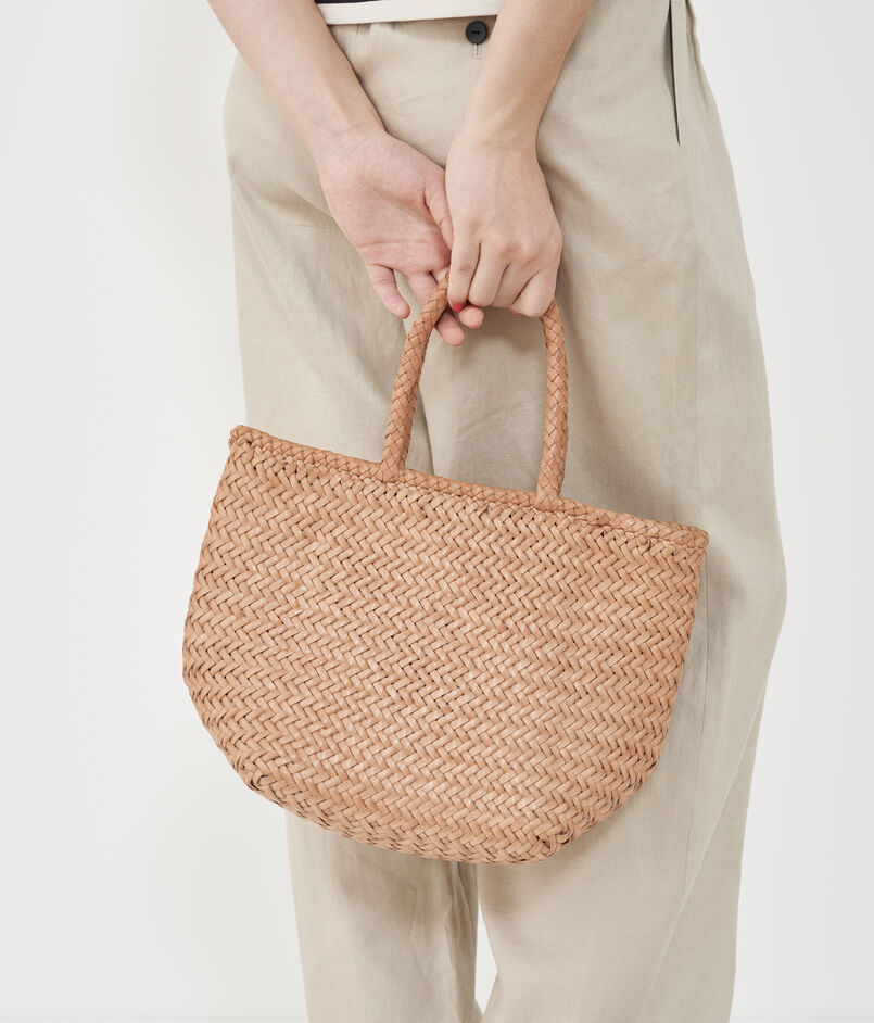 伝統的なレザークラフトへのリスペクトから生まれたテクニックと、レザーストラップのナチュラルベジタブルダイ加工を施した、ハンドメイドの編み込みレザーハンドバッグが人気です。