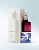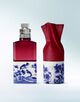 デルフト陶器に着想を得た、魅惑的で唯一無二のポーセリンに、深いバーガンディのガラスを組み合わせたボトル。