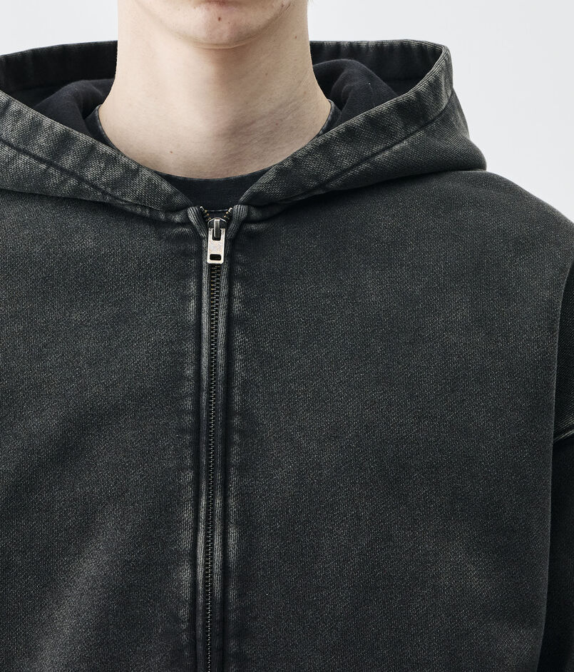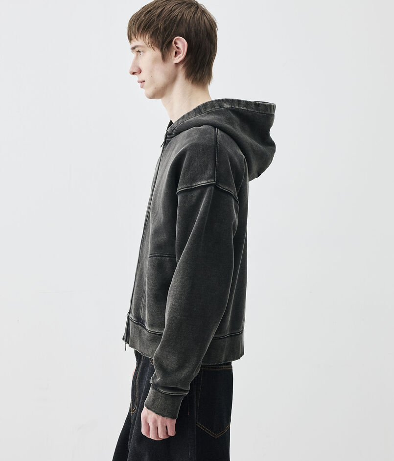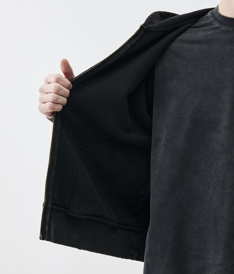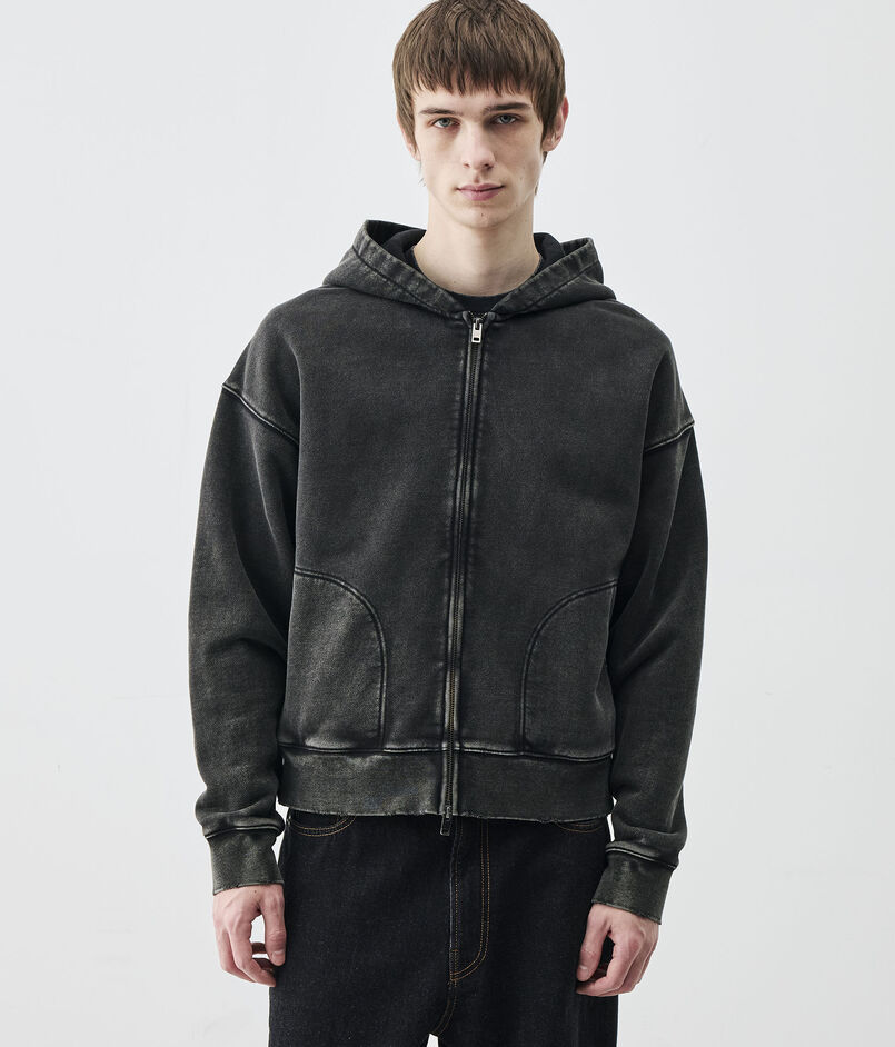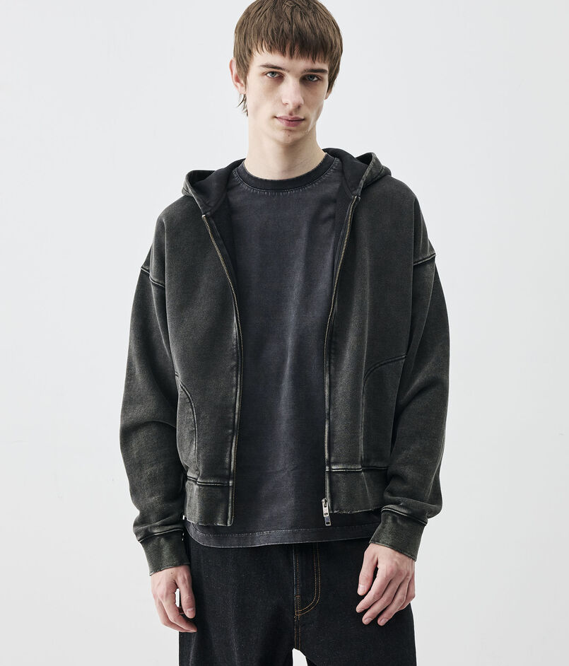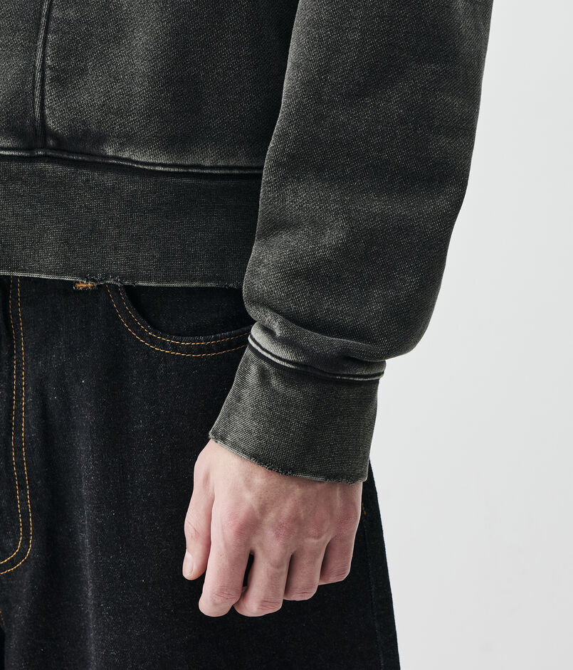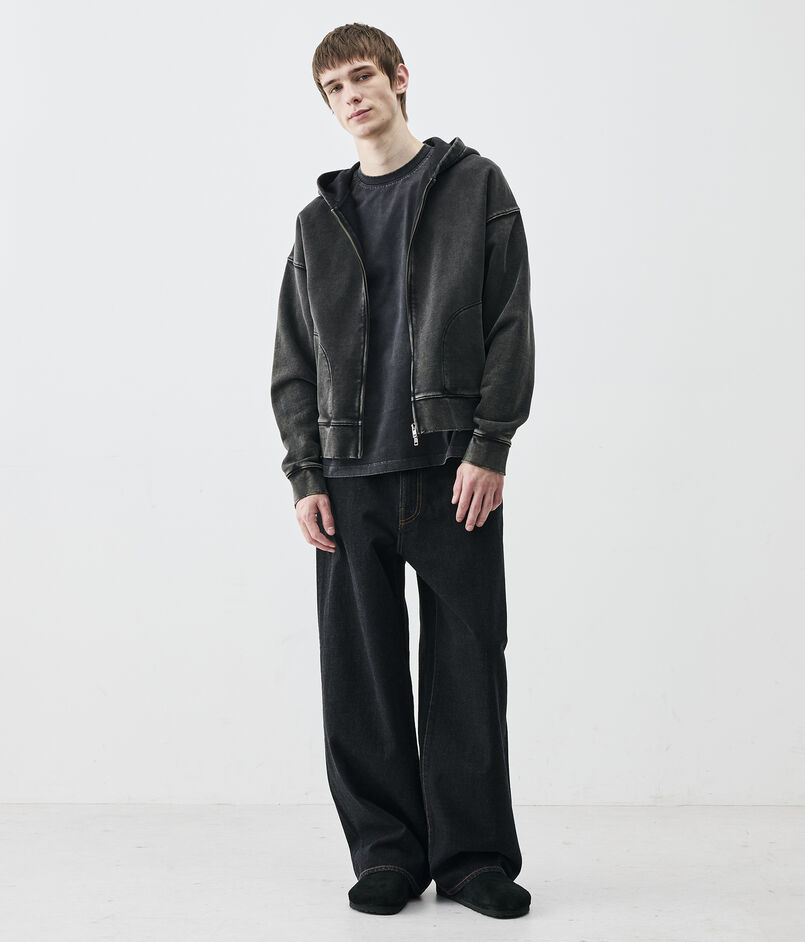 製品硫化染めとケミカルウォッシュ、グラインダー加工を施したブラックカラーとスプレー加工とウォッシュ、グラインダー加工を施したグレーの2色展開。