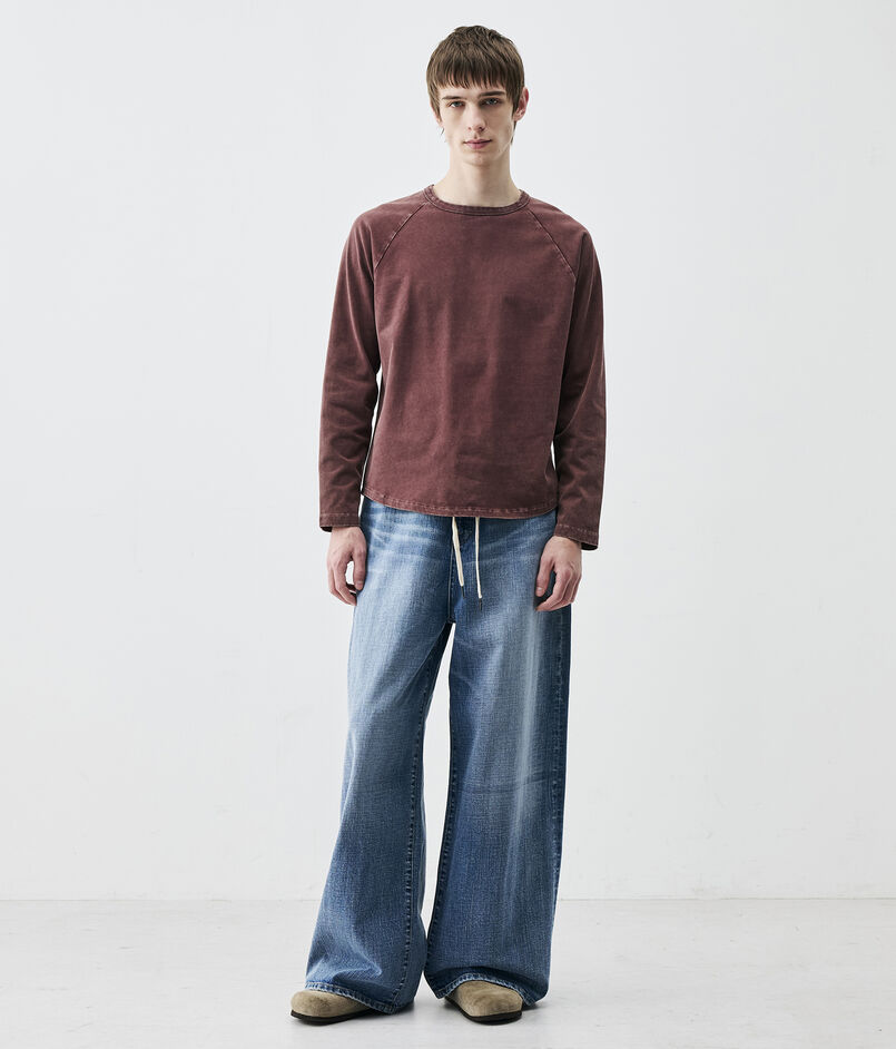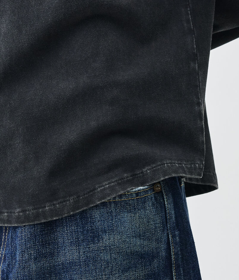 製品硫化染めとケミカルウォッシュ加工を施し、ビンテージライクな表情を生み出しています。