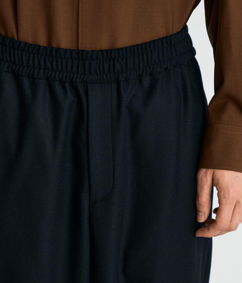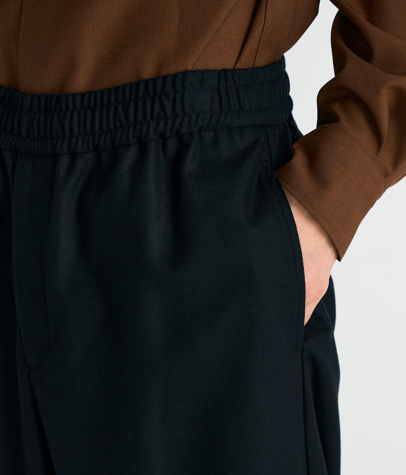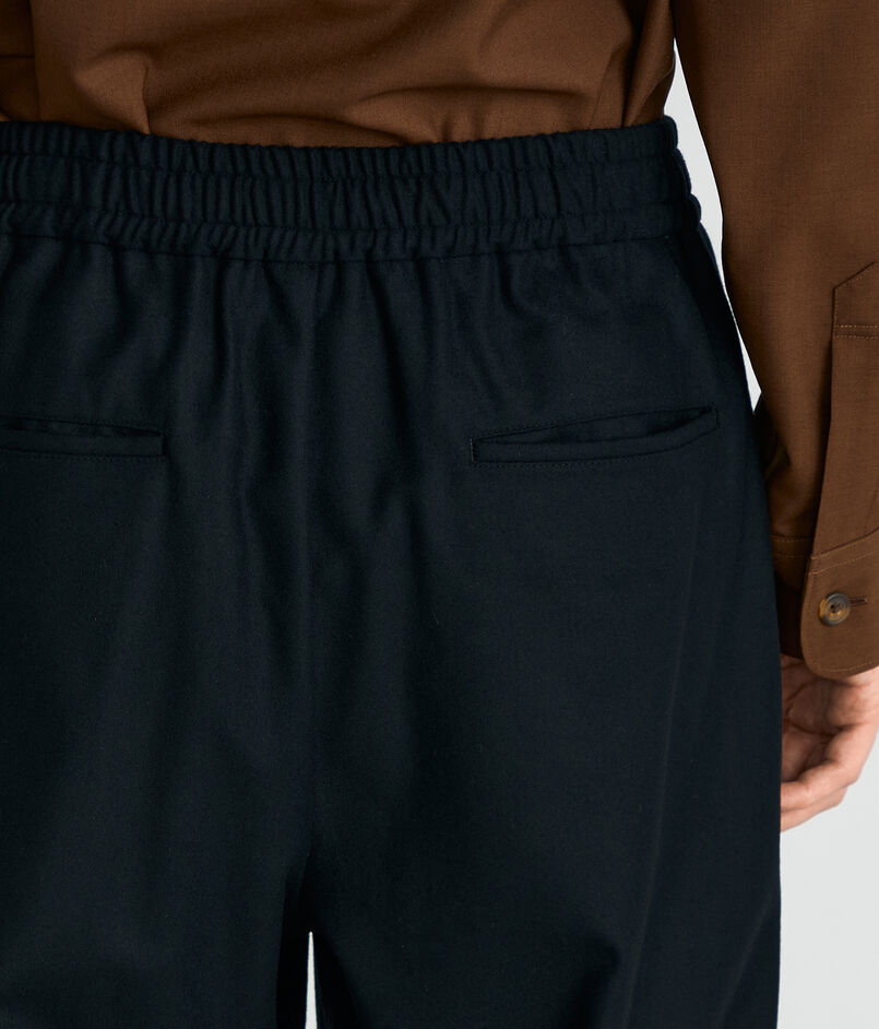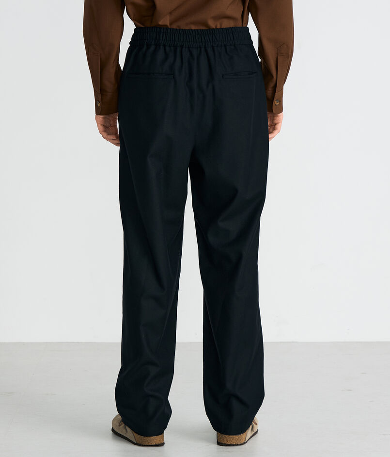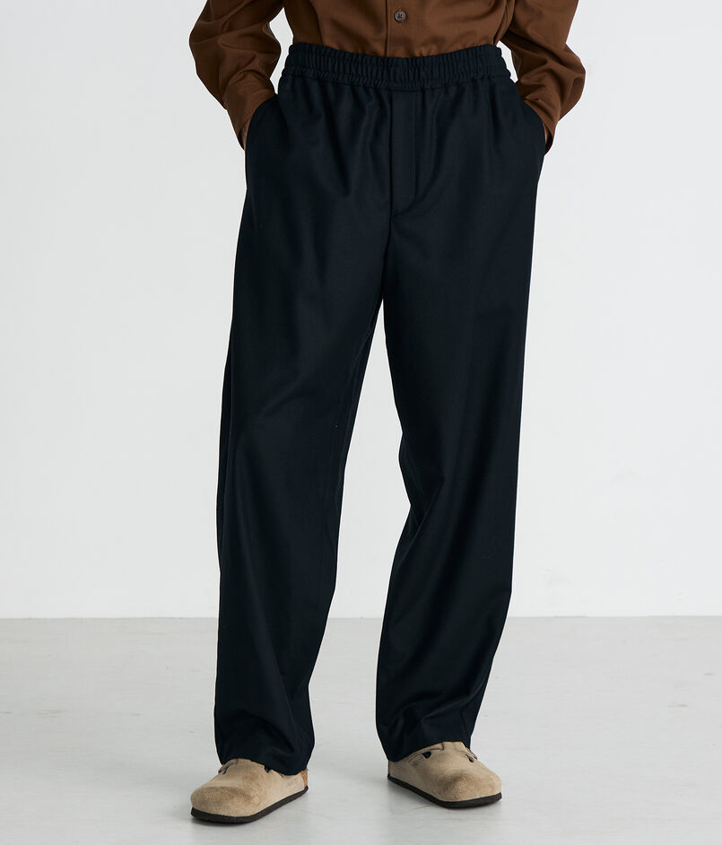 世界でも有数の高級毛織物産地である尾州でSP120梳毛原料を用いて綾織りし、世界メゾンブランド御用達の工場にて3回以上の縮絨工程を繰り返して仕上げたカレッジフラノ素材を使用したパンツ。