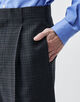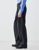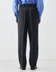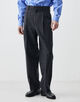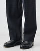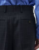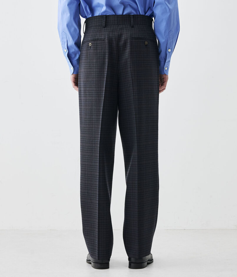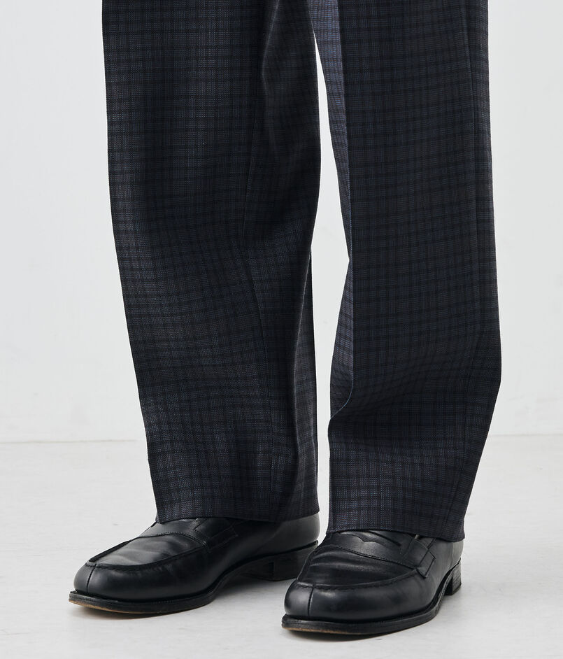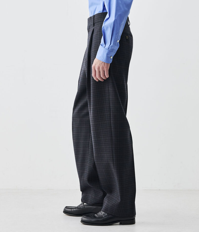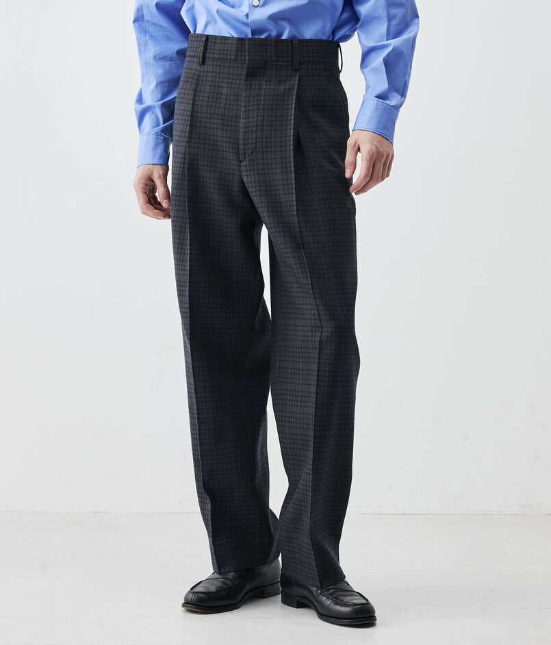 スラックスは深めのタックとワイドシルエットが特徴的な一着。