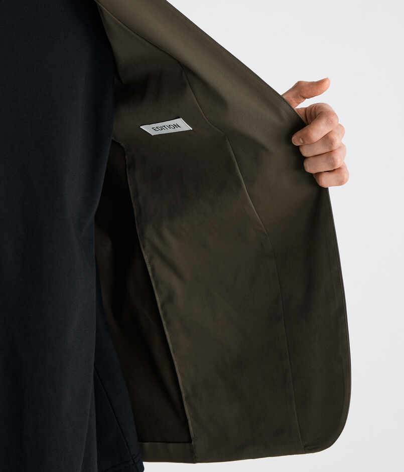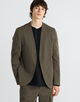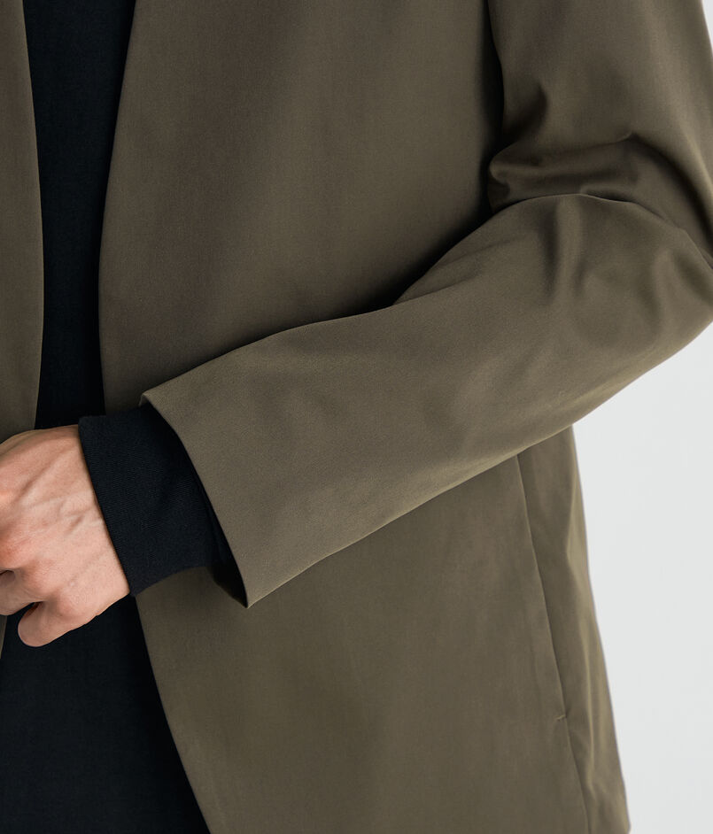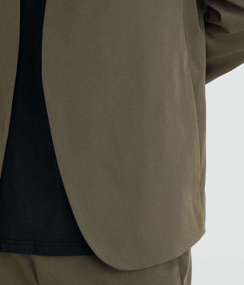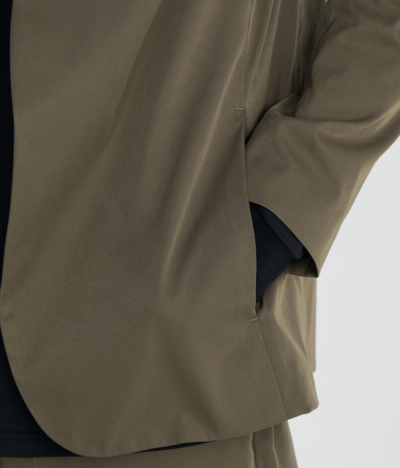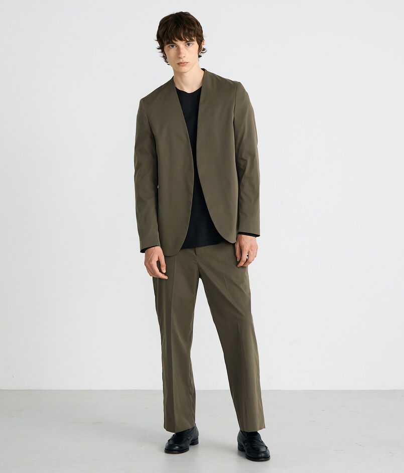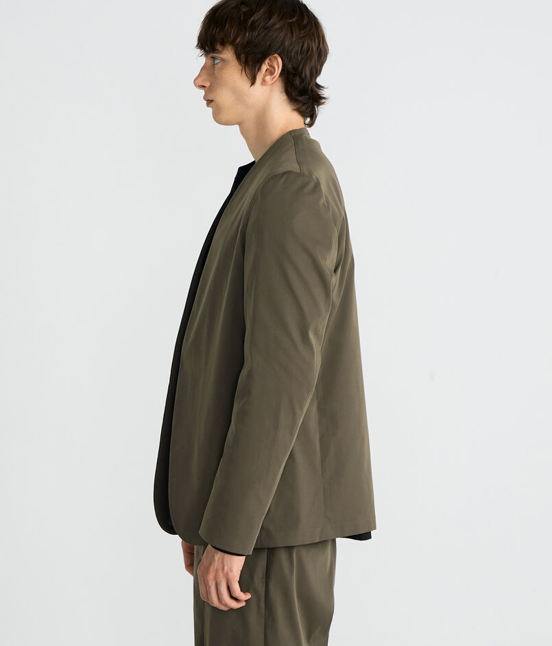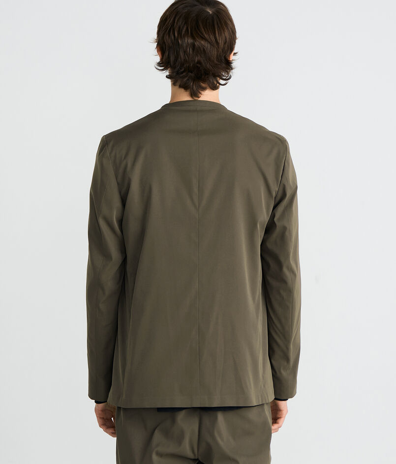 Tシャツの上に軽く羽織っても様になるノーカラージャケット。