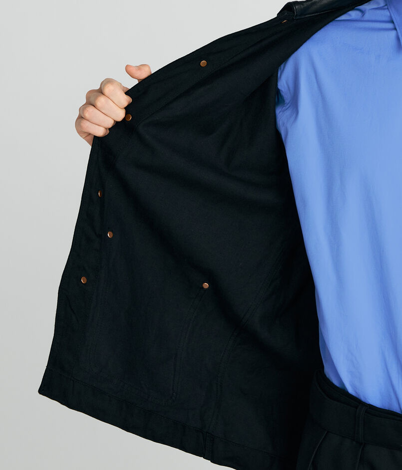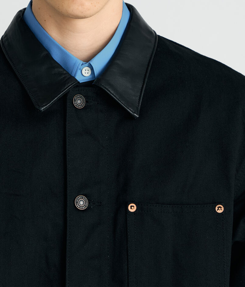 襟は天然レザーをあしらうことでコントラストを効かせています。