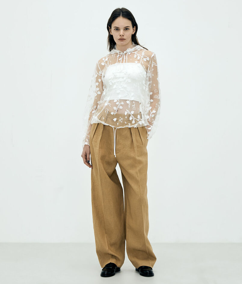 透け感を活かしてタンクトップやキャミソールをインするなど、さまざまなトップスとのレイヤードを楽しめる存在感抜群のアイテム。