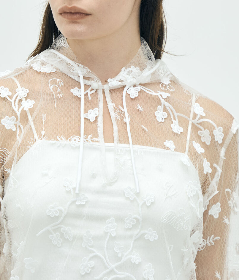 トップスは小さめに設計したフードはギャザーを寄せることで襟感覚でお召しいただける一枚。