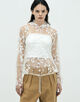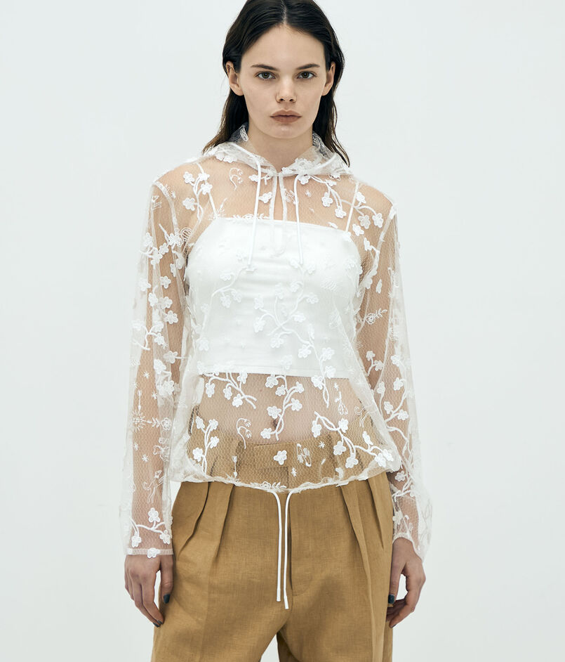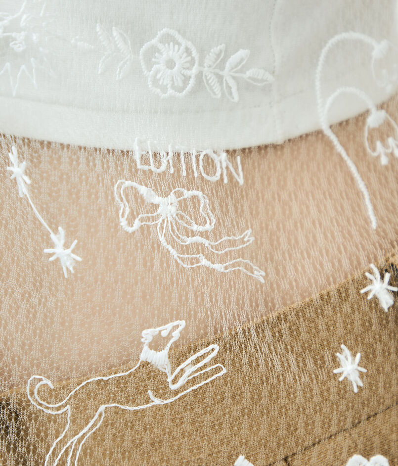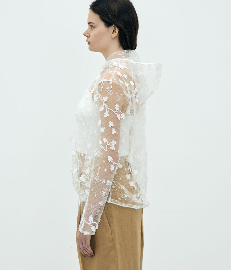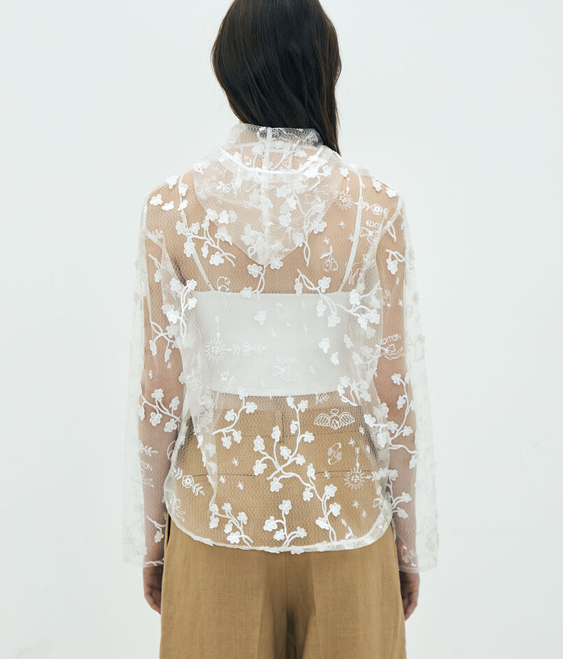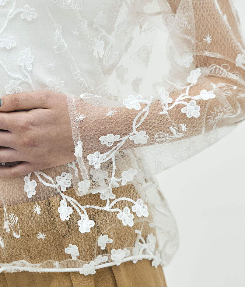 さまざまなモチーフを散りばめた遊び心溢れる〈edition pourell〉オリジナル柄を、繊細なチュール素材に刺繍したブラウスシリーズ。