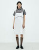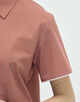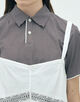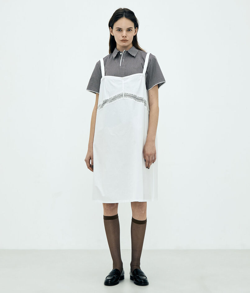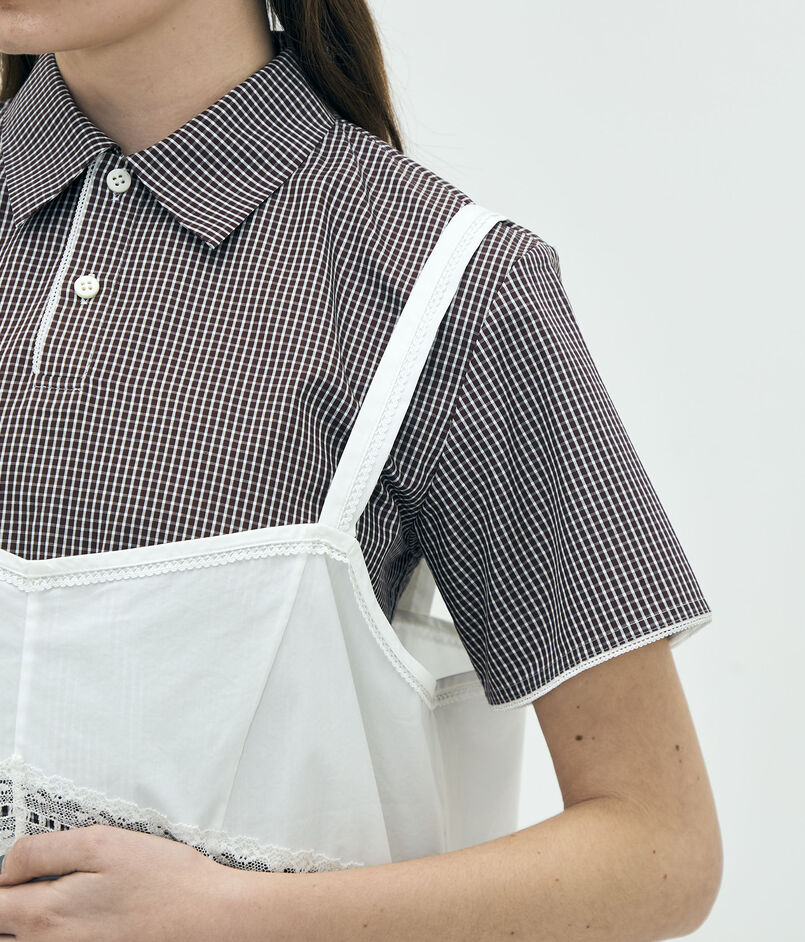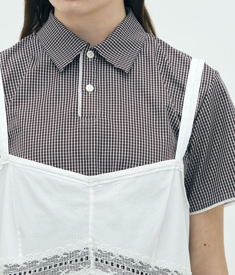 メンズドレスで使用されるような素材にガーリーなレースをディテール使いすることでほど良くフェミニンな雰囲気に仕上げた一枚。