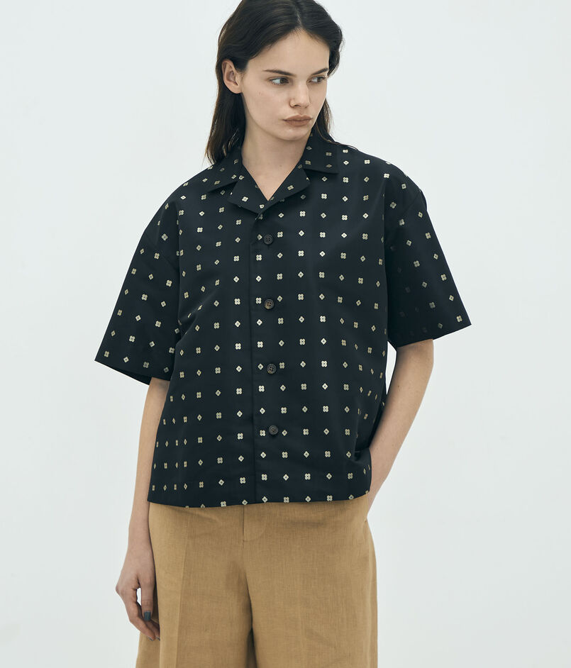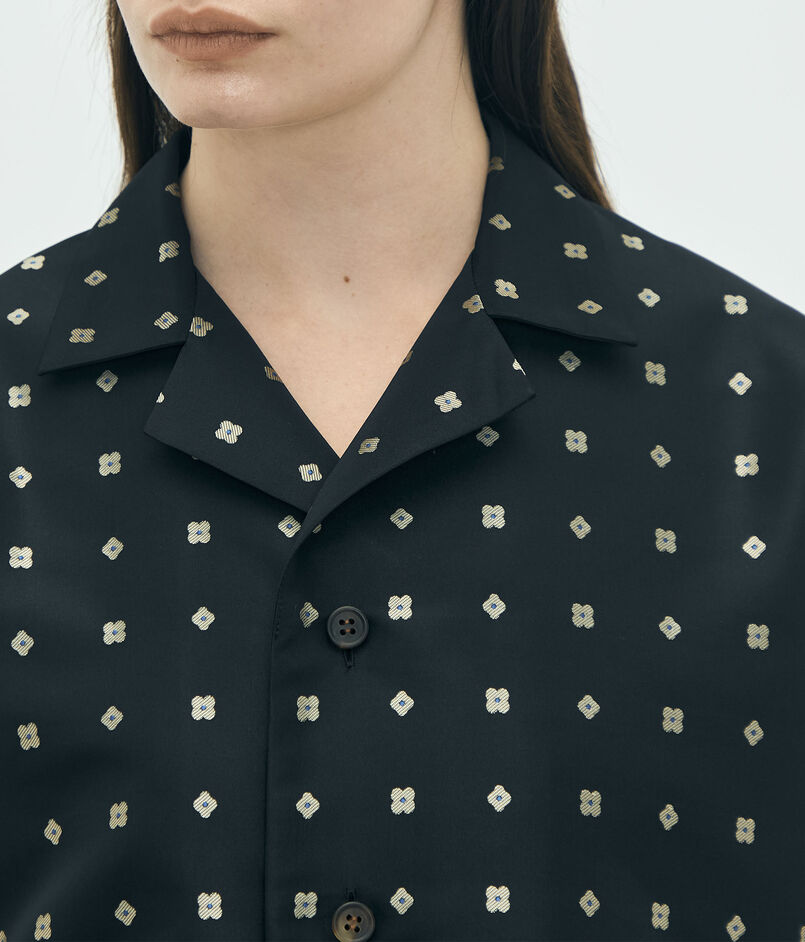 北陸の福井にある織屋にてアーカイブのネクタイ地から柄をアレンジし、〈Edition〉オリジナルで柄を作成したオープンカラーシャツ。