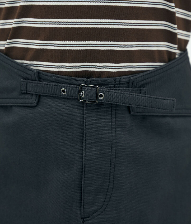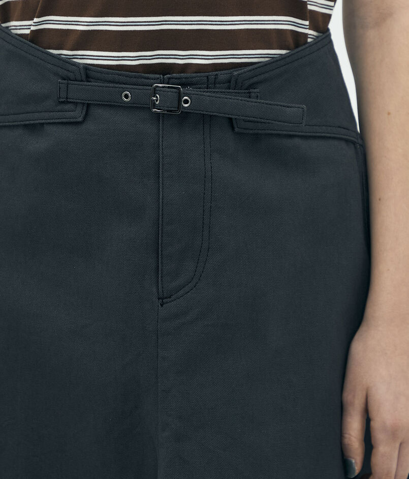 トップスをインしてフロントの特徴的なベルトデザインをポイントにして着こなすのがおすすめ。