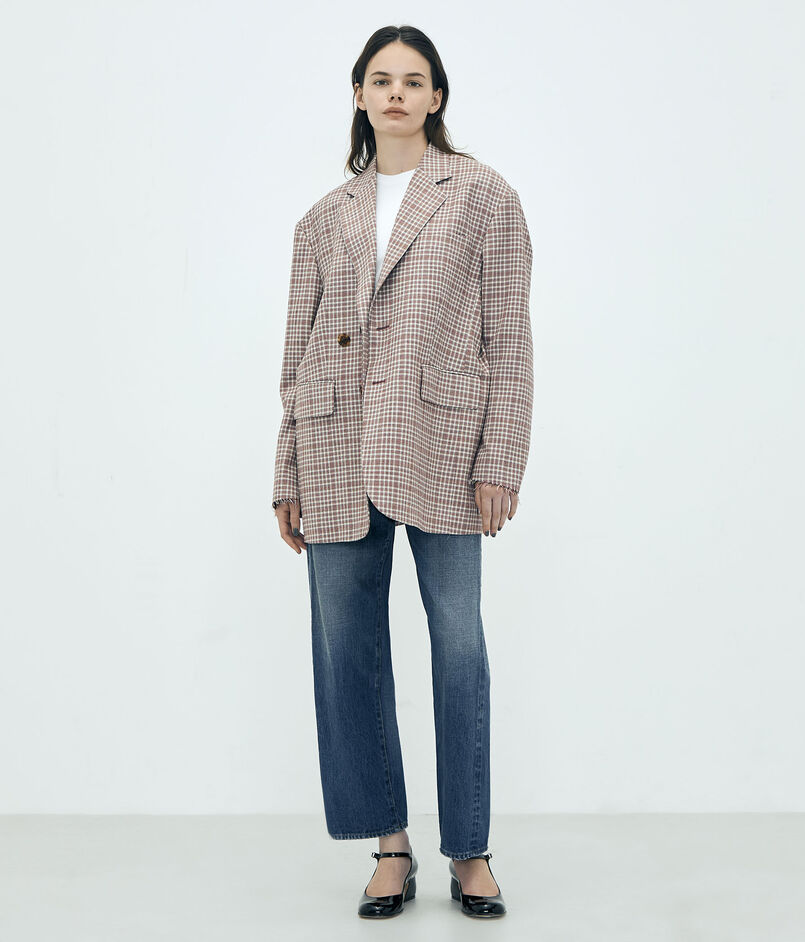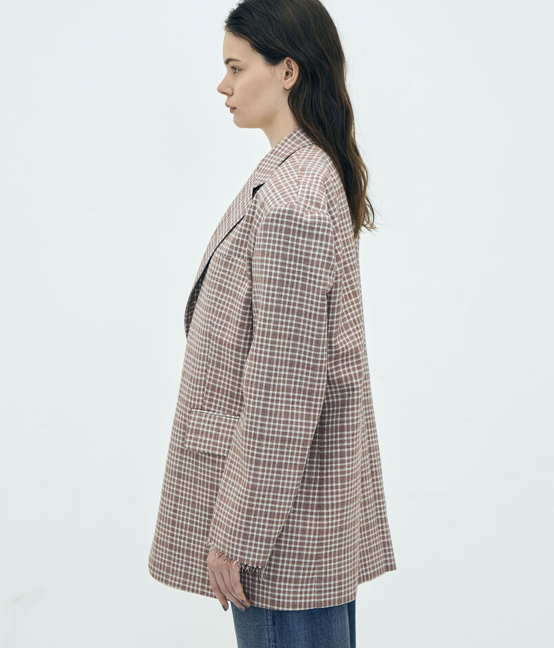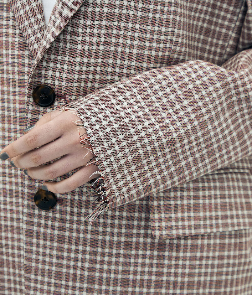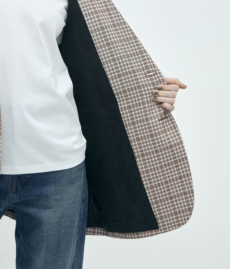 日本が誇る毛織物産地の尾州で生産された、〈Edition〉オリジナルのマルチチェック柄が目を惹くジャケット。