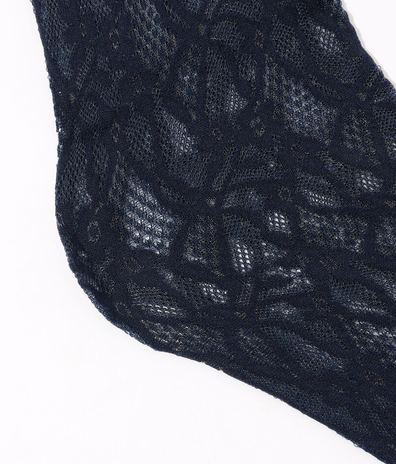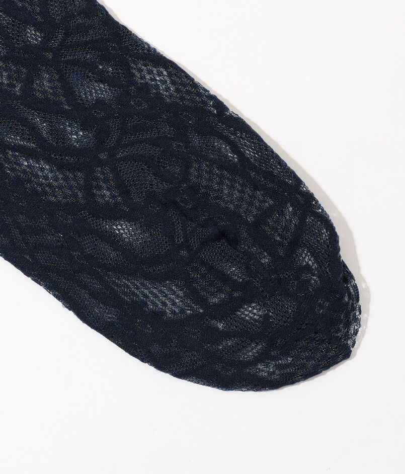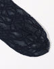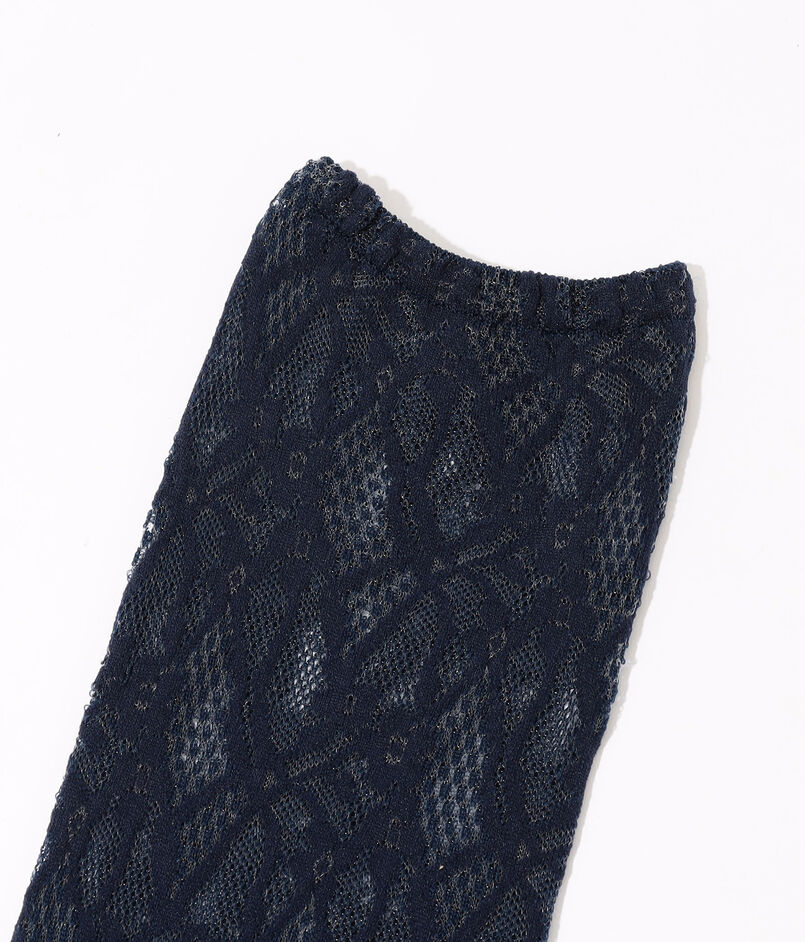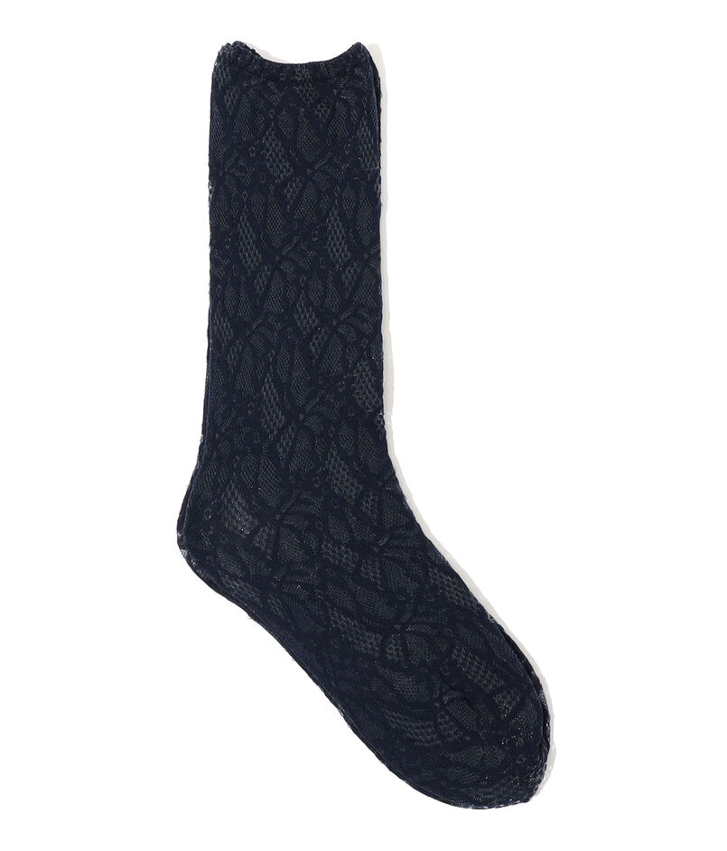 柄をジャカードで編み上げて透かしのような表現をした、センシュアルなムードのソックス。
