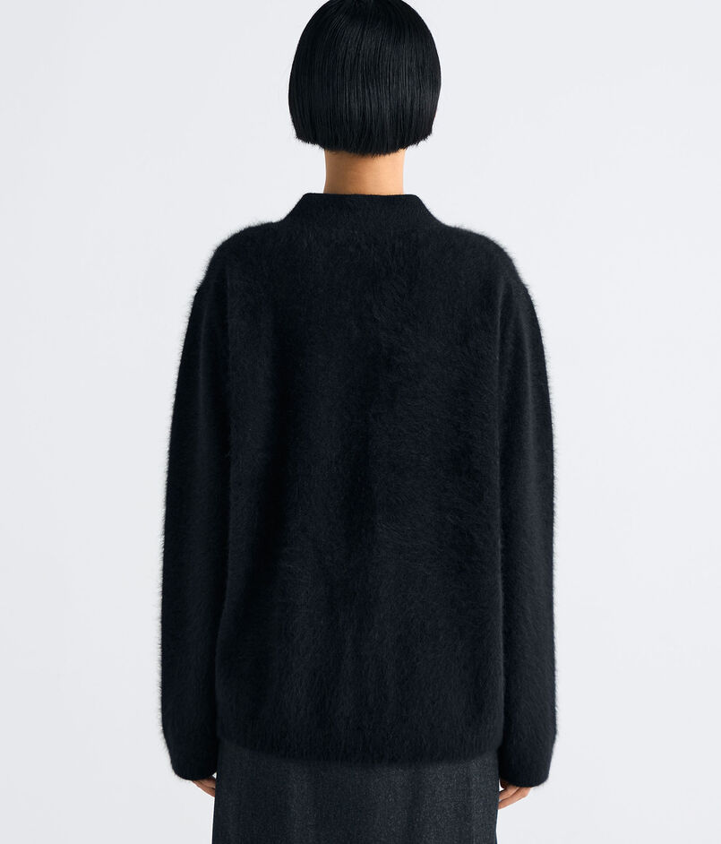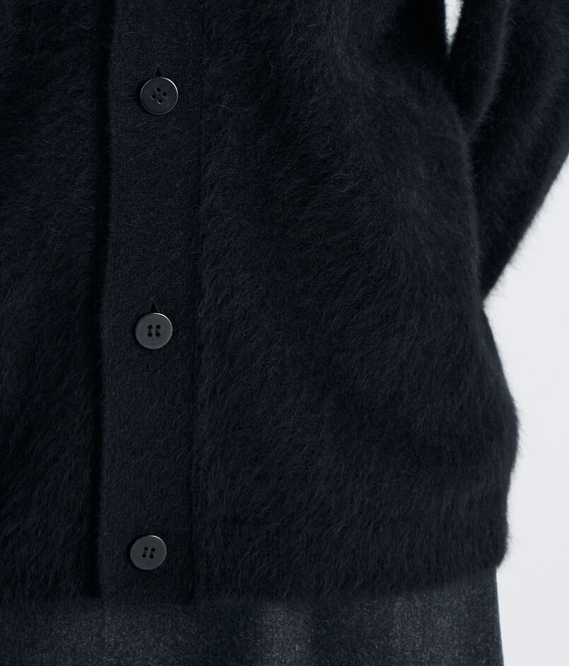 フォックス・ウール・シルクをブレンドした糸にシャギー加工を施し、ふんわりとした風合いと軽やかな温もりを実現。
