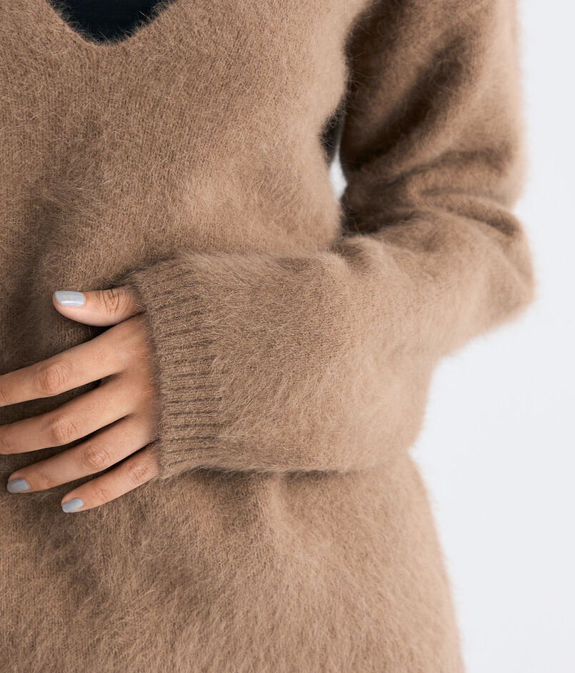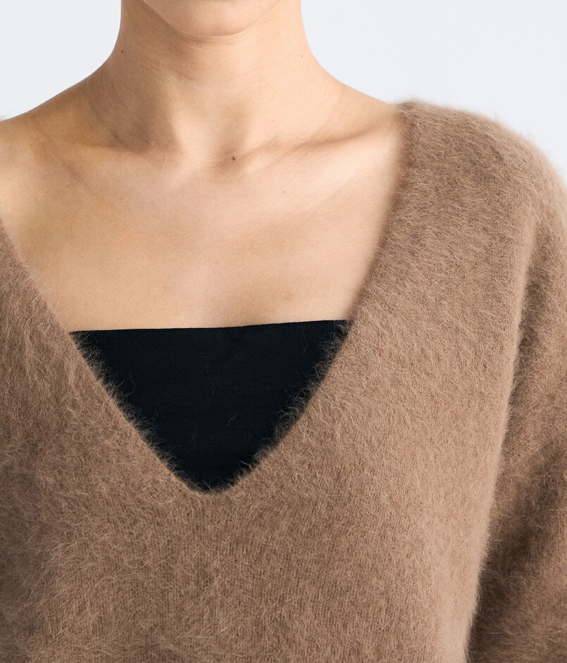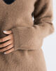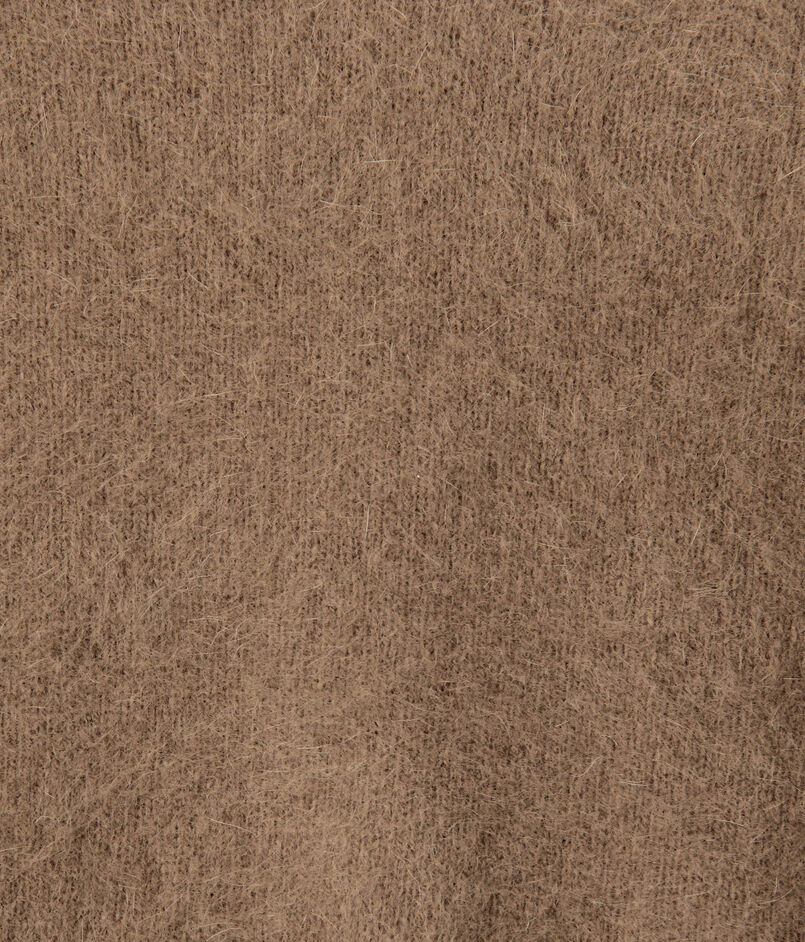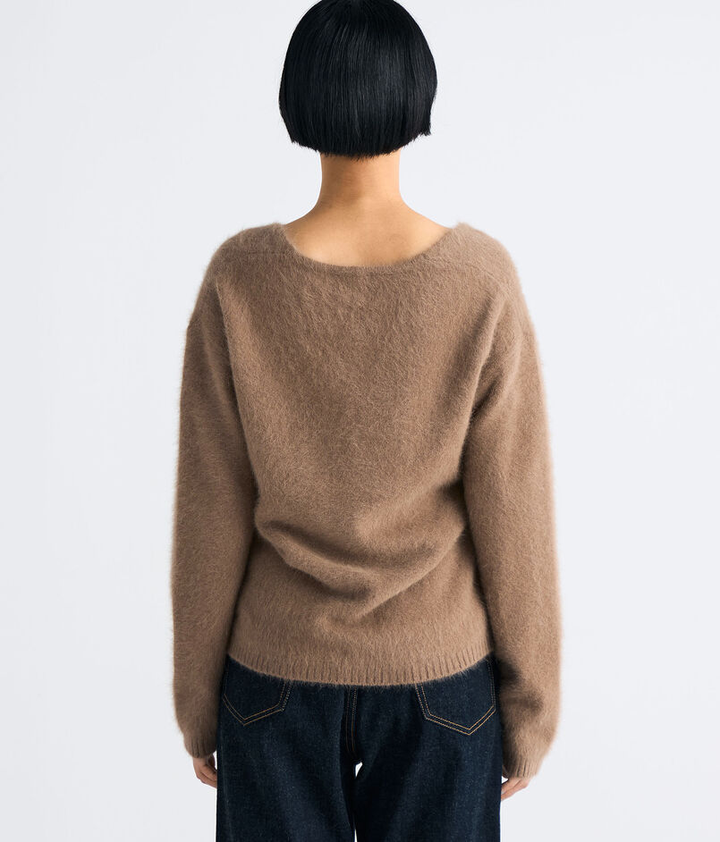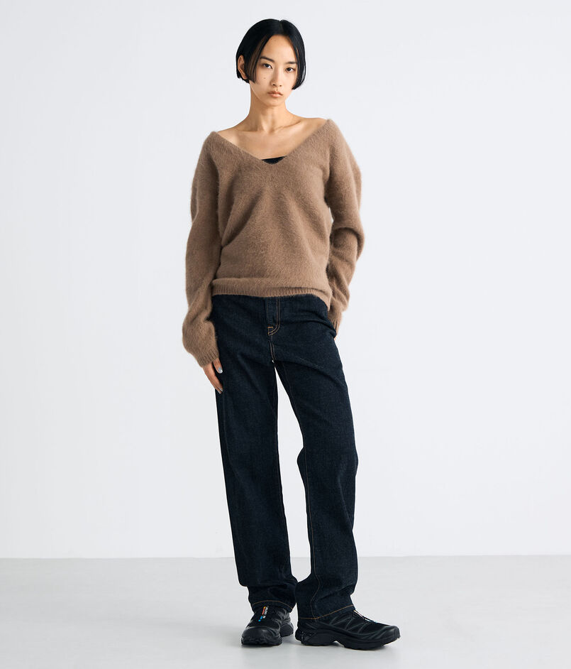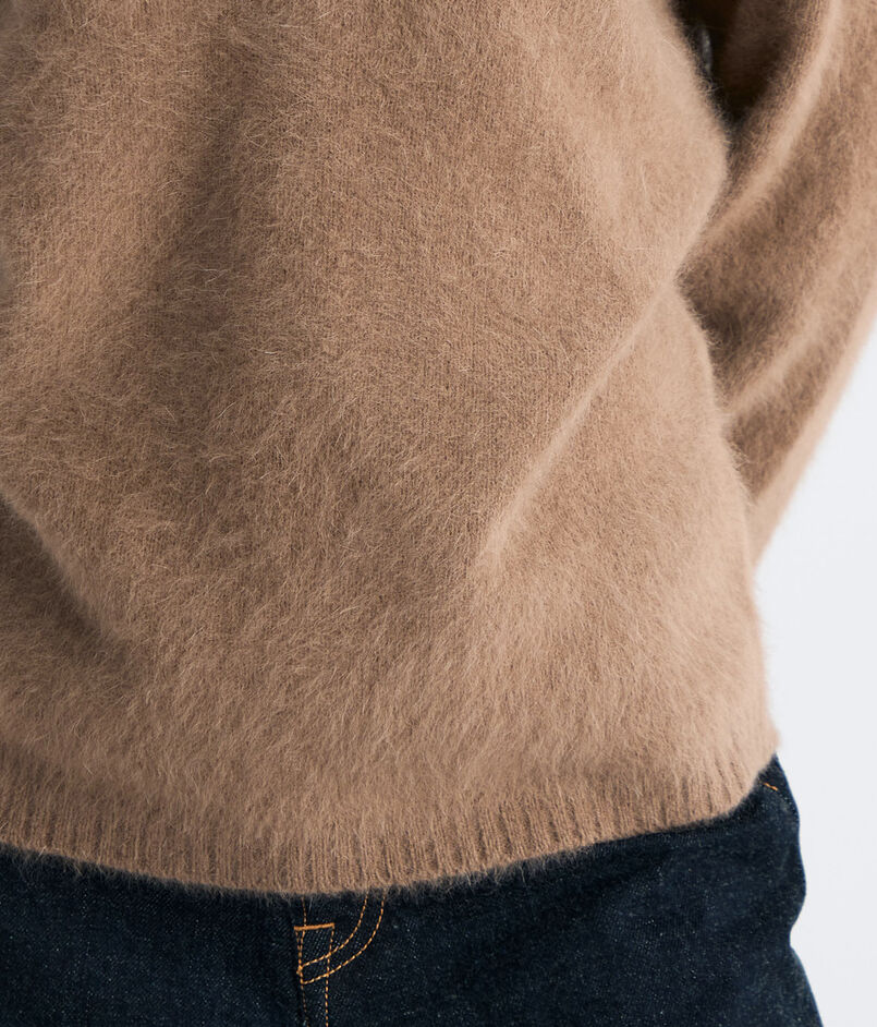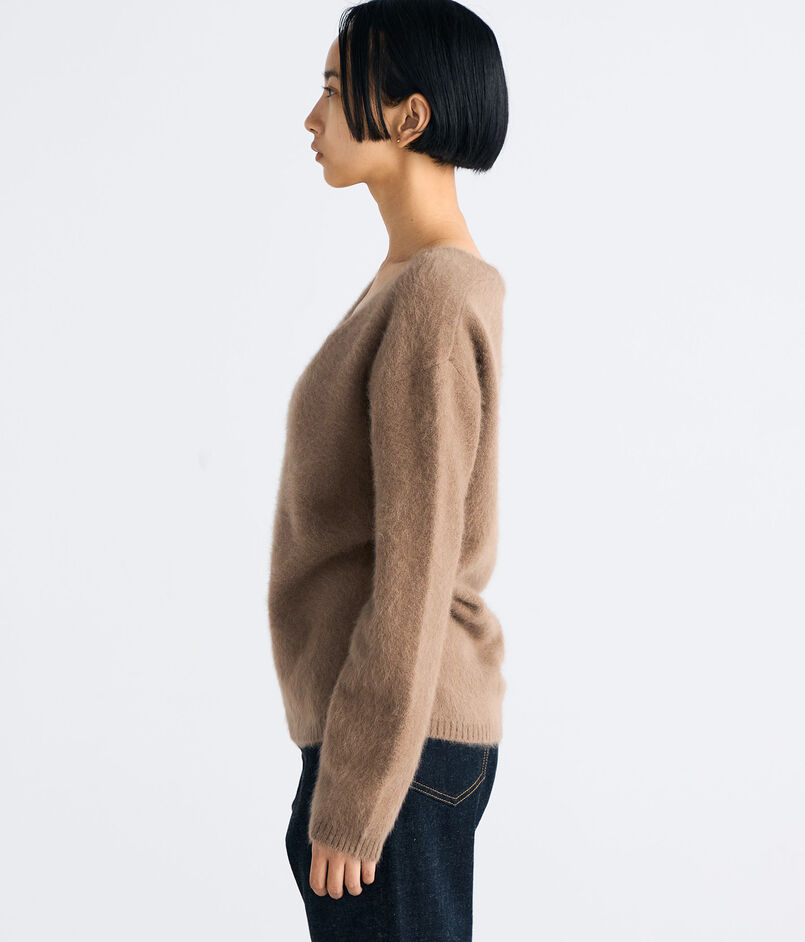 フォックス・ウール・シルクをブレンドした糸にシャギー加工を施し、ふんわりとした風合いと軽やかな温もりを実現。
