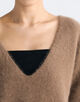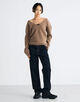やわらかな肌触りと高い保温性を兼ね備え、着用した際に少しうしろにぬけるように設計し、こなれ感を演出したシルエットのニットです。