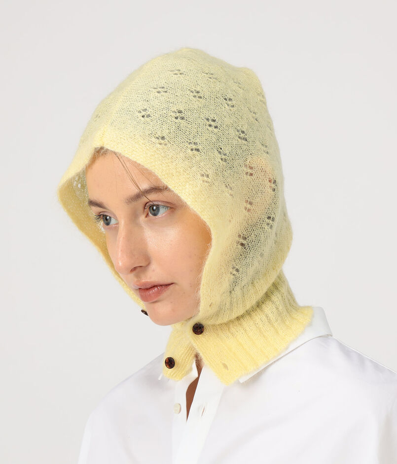 スーパーキッドモヘア混の糸で編み上げた、ソフトな肌あたりで心地良いバラクラバ。