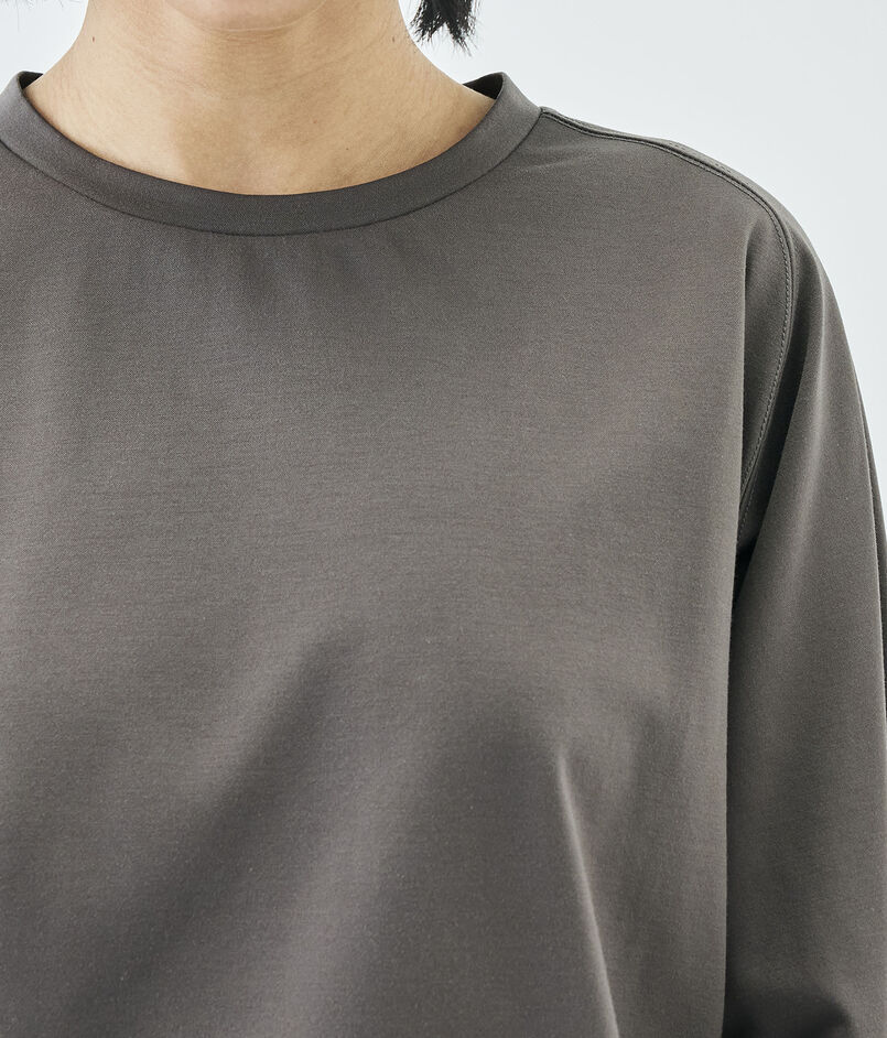 コットンのカシミヤとも呼ばれる細番手のスーピマコットンと優れた伸縮性と回復力のある高収縮ポリエステルを希少なハイゲージダブル編み機を駆使して交編した上質なモックロディ素材を使用したプルオーバー。