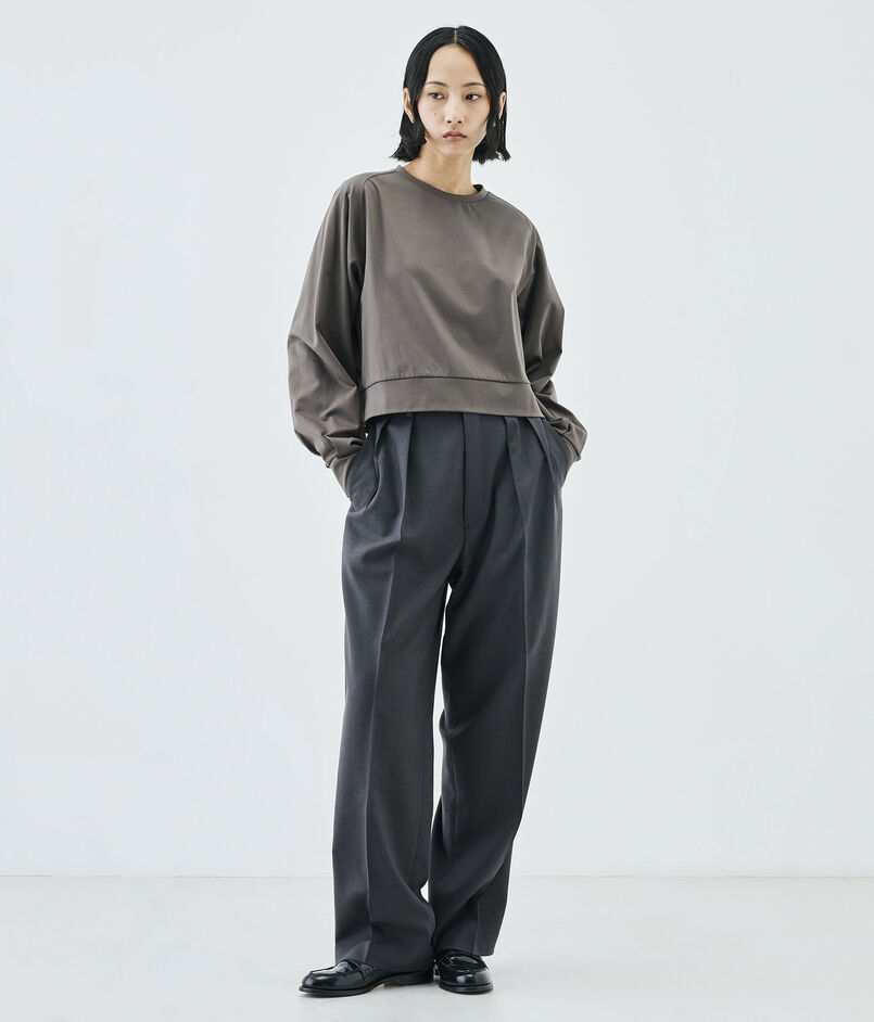 袖口にはタックを取り、着丈をクロップド丈にすることで女性らしさを感じるバランスに。