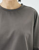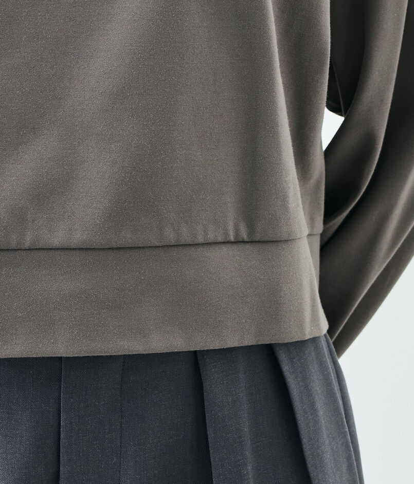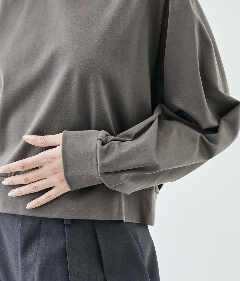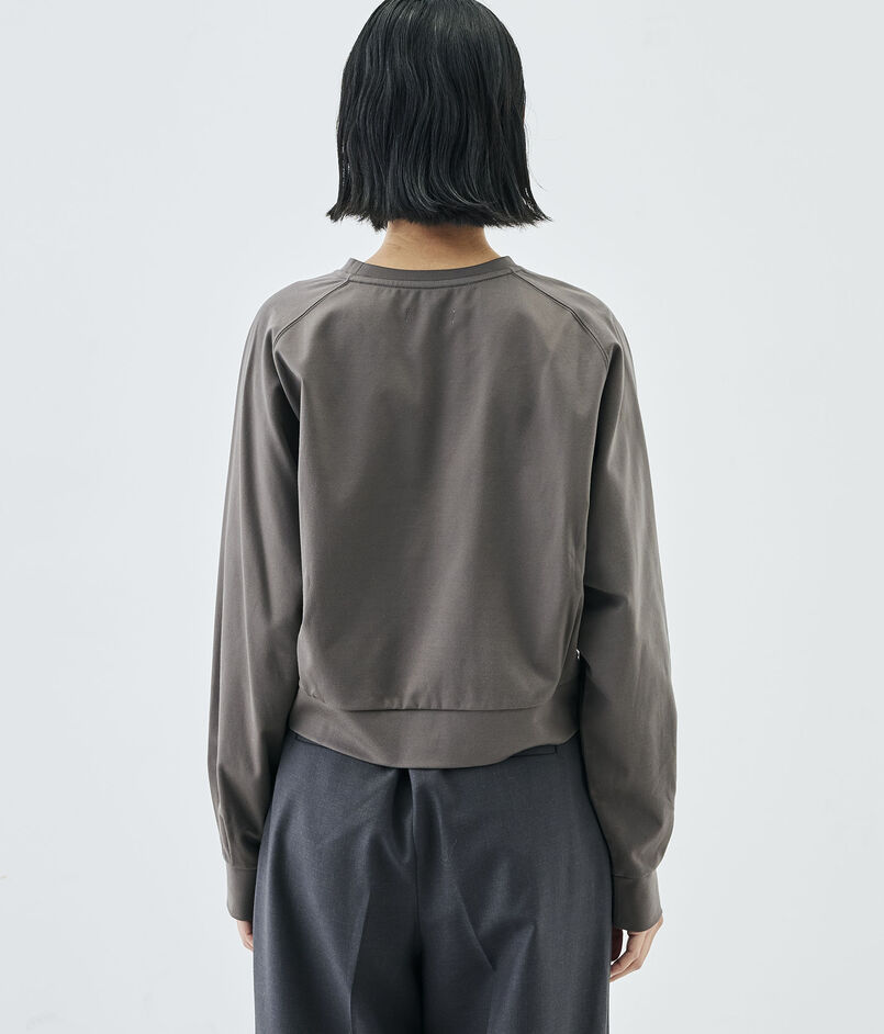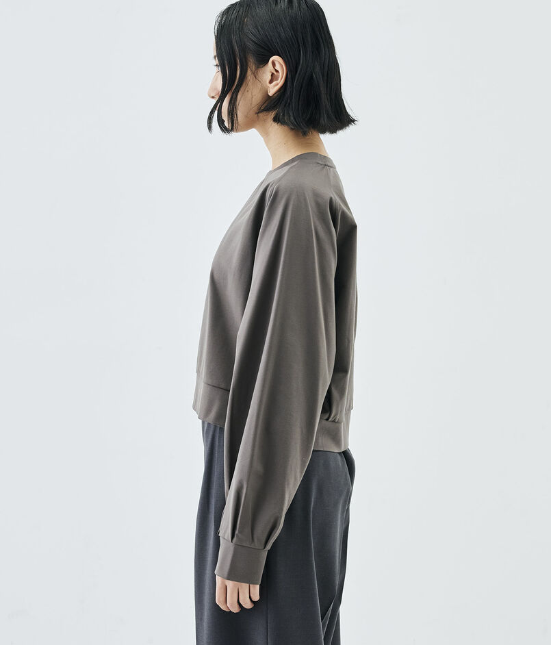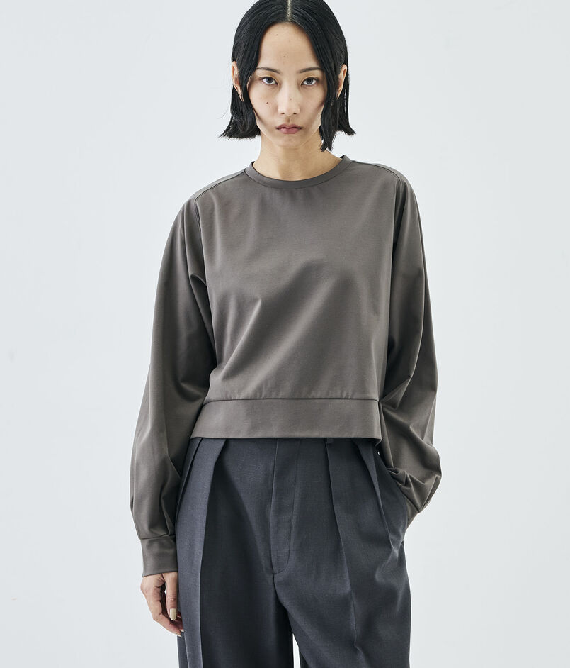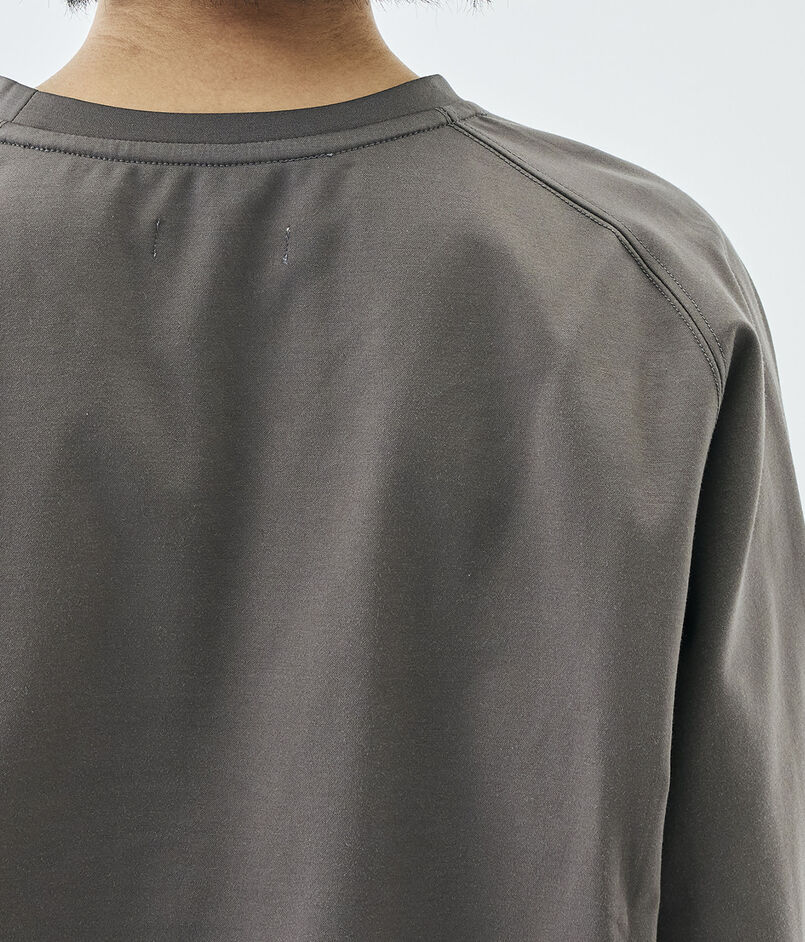 コットンのカシミヤとも呼ばれる細番手のスーピマコットンと優れた伸縮性と回復力のある高収縮ポリエステルを希少なハイゲージダブル編み機を駆使して交編した上質なモックロディ素材を使用したプルオーバー。