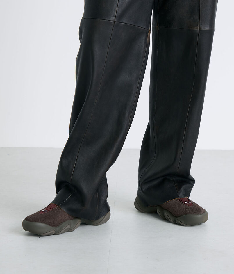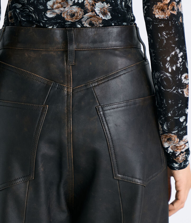 パキスタン原皮をパキスタンタンナーにて鞣しから染色を行い、アンティーク感を出したレザーパンツ。
