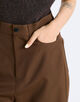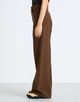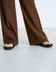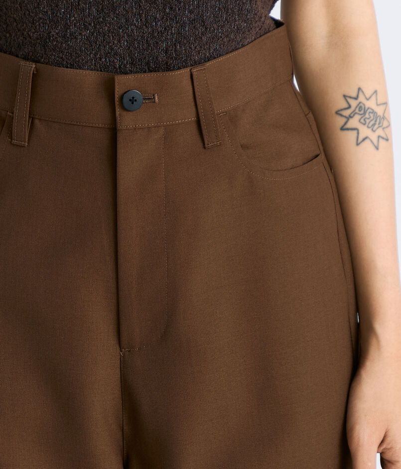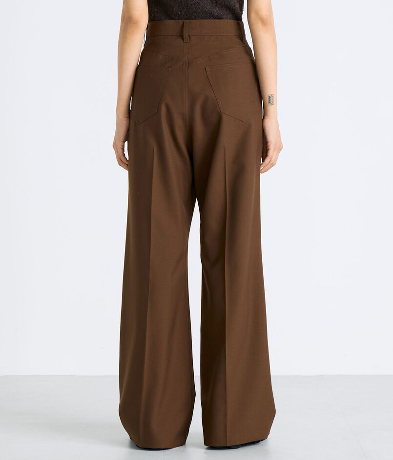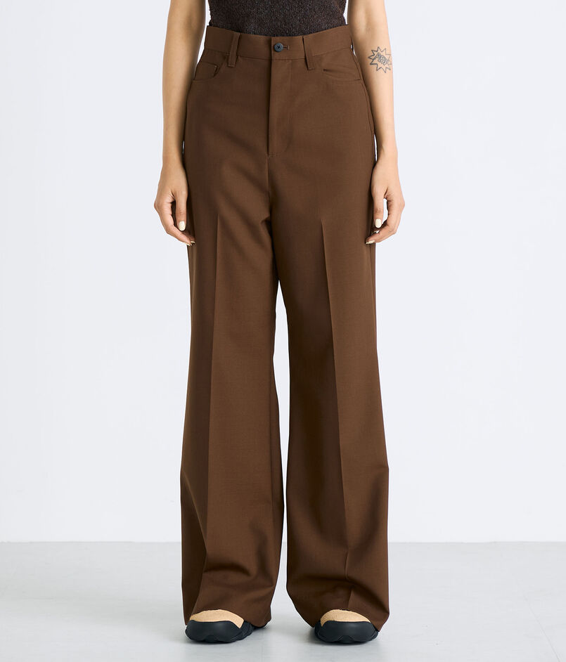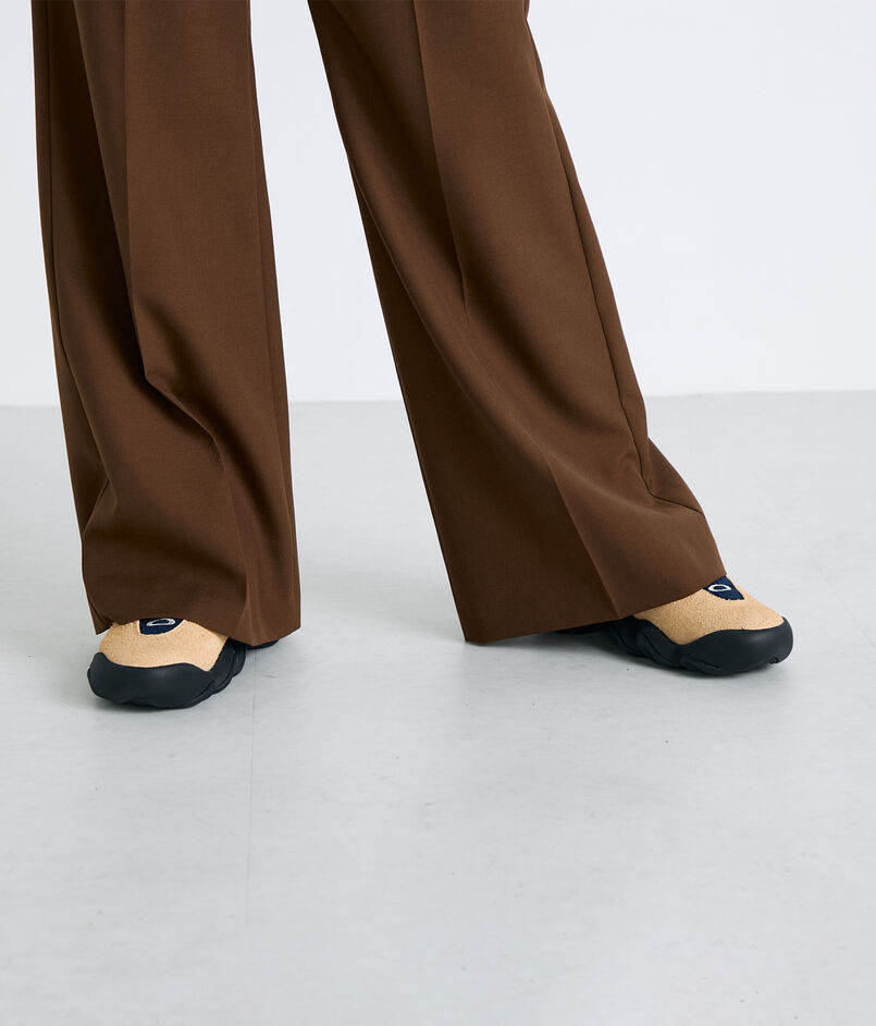 丁寧に織り上げる事で通常のウールには出せないポリエステルの光沢感も表現されています。高めに設定したウエストラインからヒップにかけて美しいシルエットになるようにこだわって仕上げたフレアパンツ。