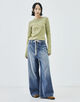 デニム原料のコットン繊維がしっかりと紡がれているので、糸の目が細かくなめらかな着心地を実現しています。