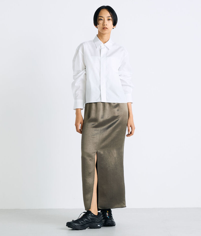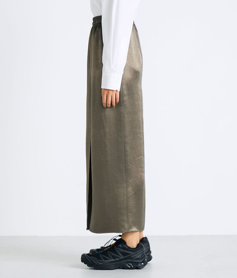 ほど良く厚みのあるサテンに表面加工をほどこすことで、きれいめになりすぎず、表情をもたせた素材が特徴のIラインスカート。