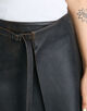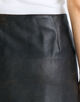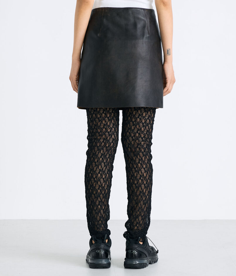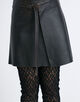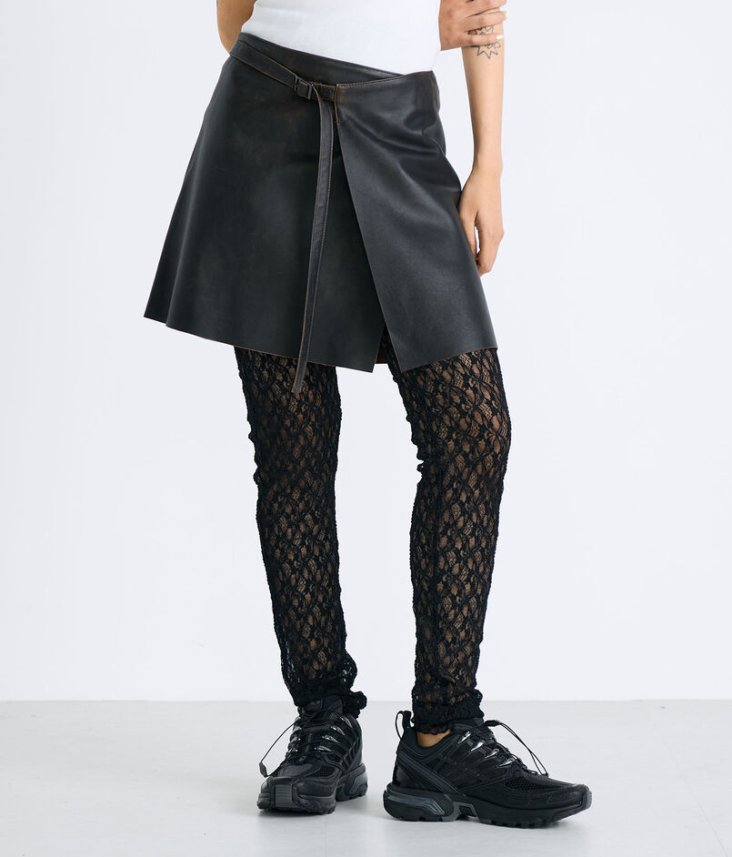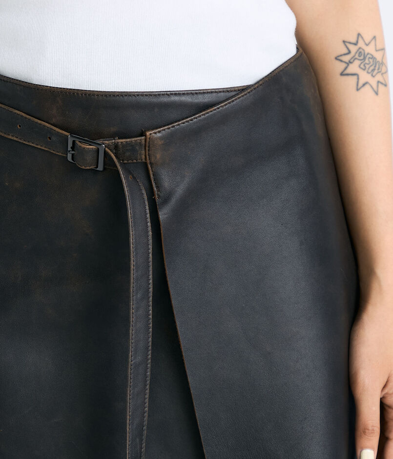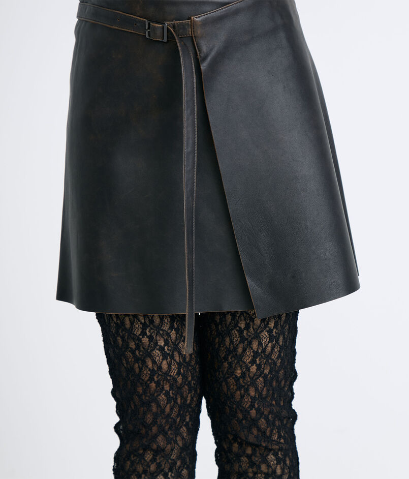 パキスタン原皮をパキスタンタンナーにて鞣しから染色を行い、アンティーク感を出したレザーラップミニスカート。