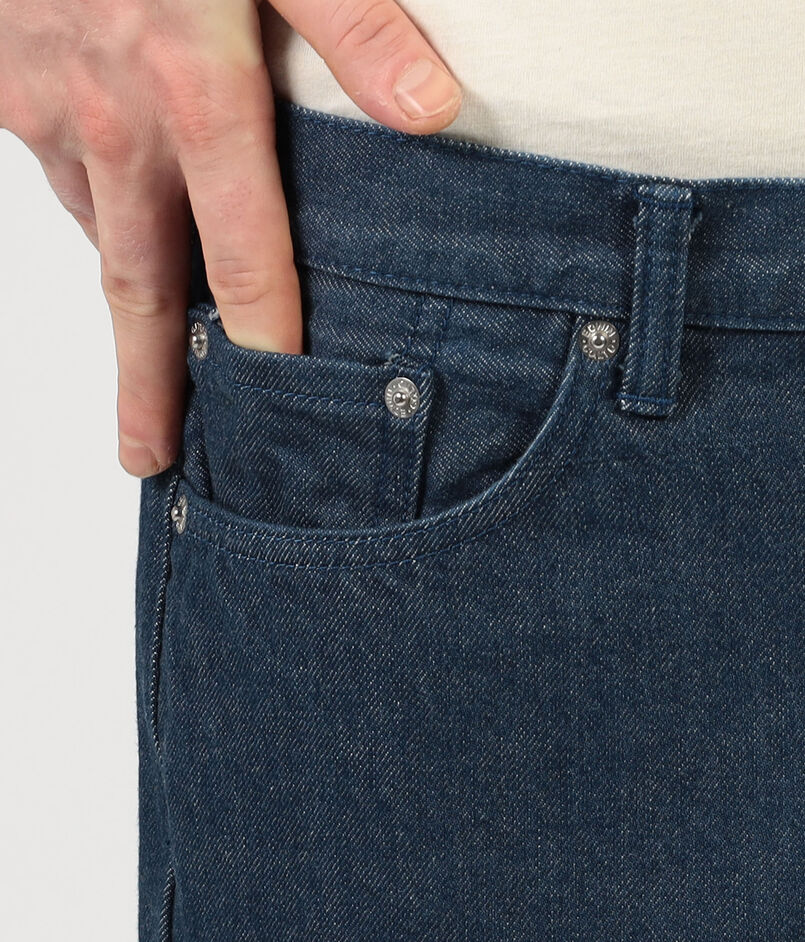 染色方法は硫化染料を使用しロープ染色で染め上げているため、適度な色落ち感が感じられます。