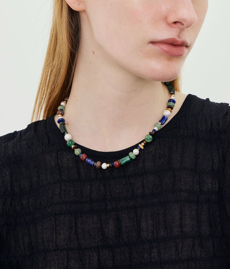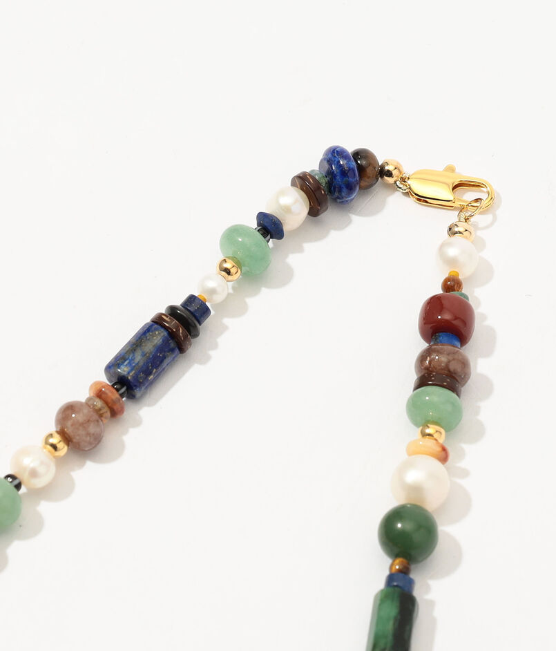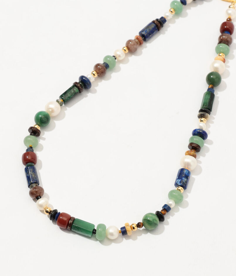 淡水パールに加え、ジェイドやラピスラズリなどのセミプレシャスストーンを組み合わせたネックレス。