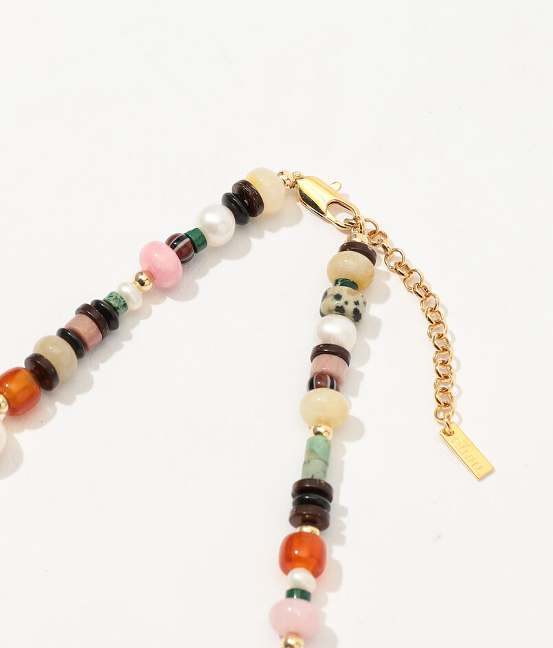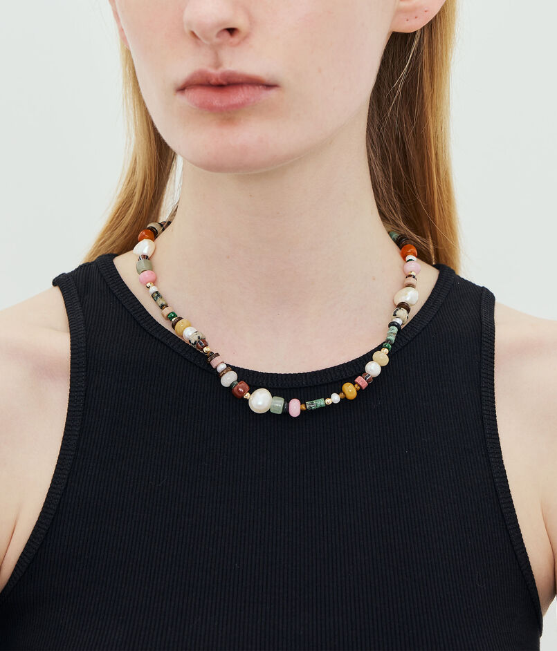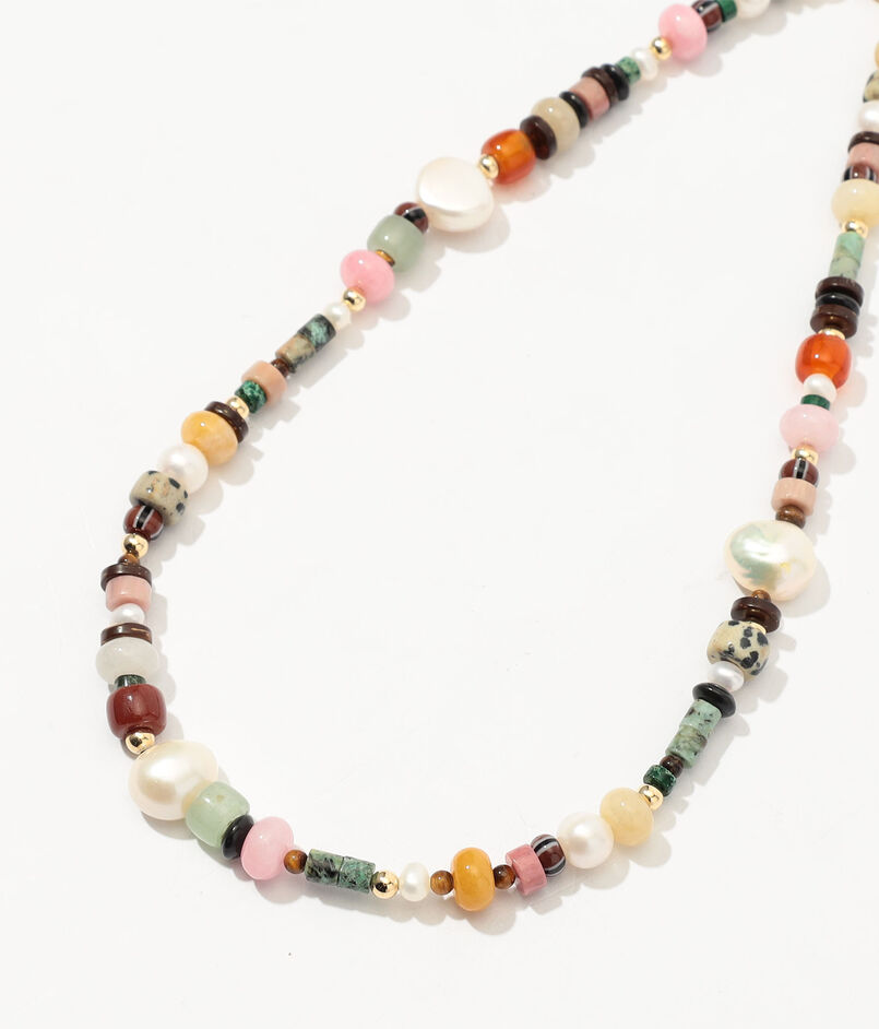 多彩な素材をミックスした、遊び心あふれるネックレス。