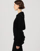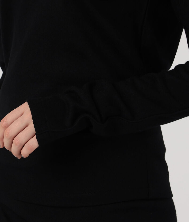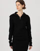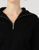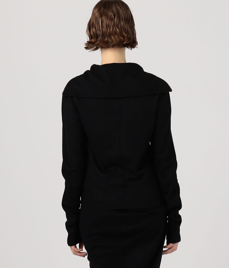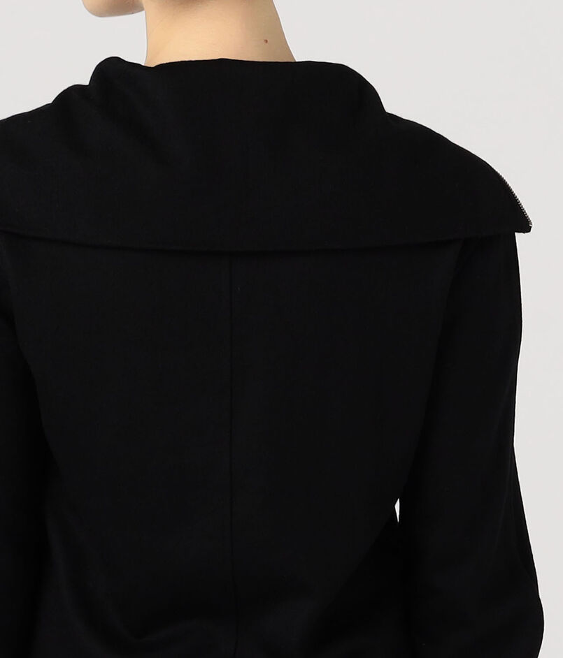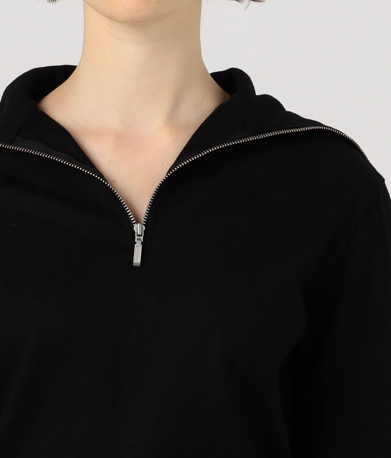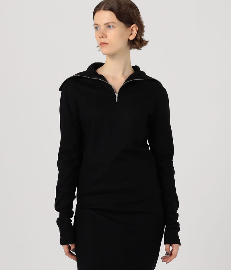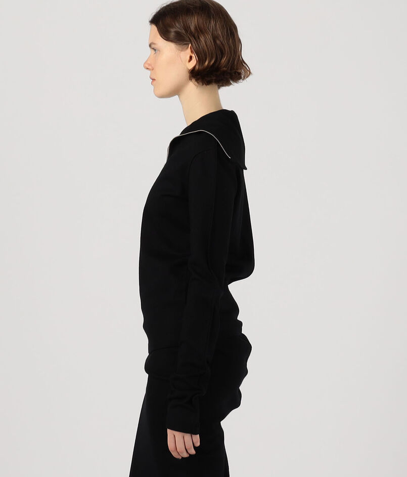 深めに開けるとセーラーカラーのように、上まで閉めるとタートルネックとして着用できるので、ジップの開き具合で印象を変えていただけます。