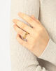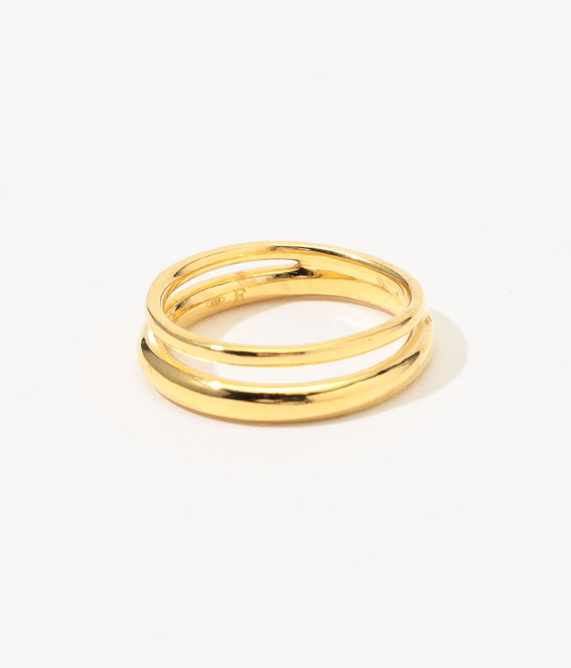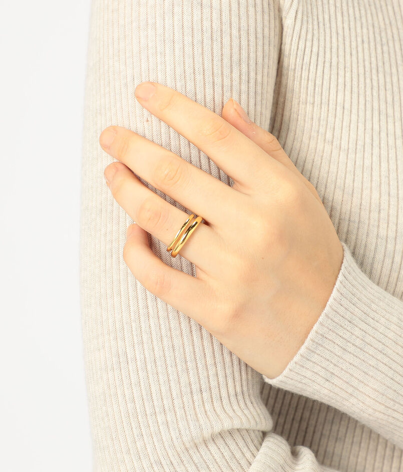 ポリッシュ仕上げの8Kイエローゴールドの2本のリングが、完璧なハーモニーを奏でながらシームレスに融合し、モダンでありながら時代を超越した彫刻的なシルエットを生み出しています。