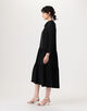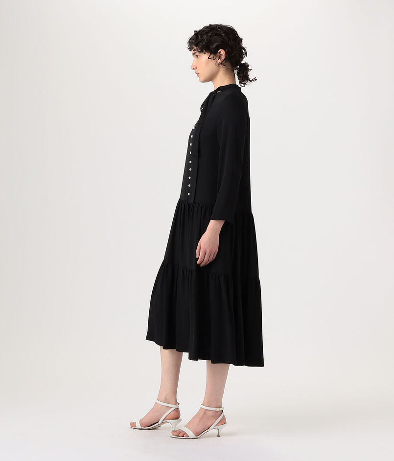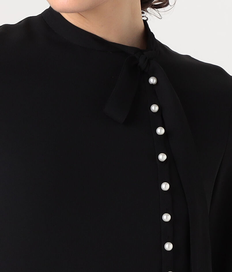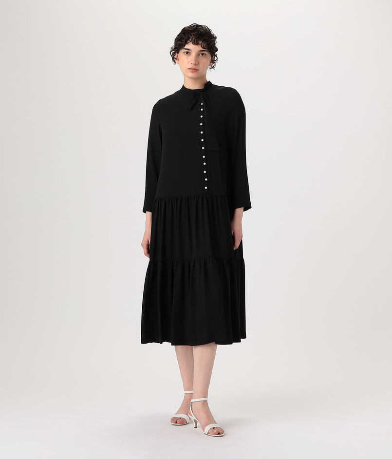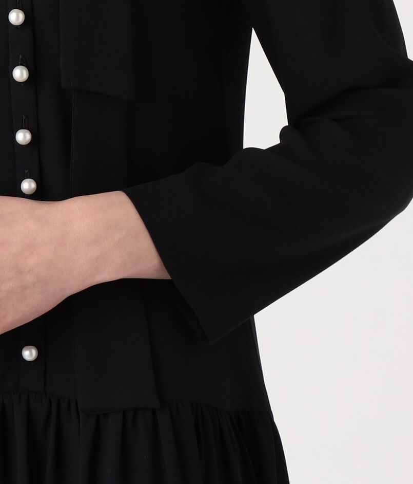 パールの上品なアクセントが華やかさを加え、マニッシュなボウタイが洗練された印象のワンピース。